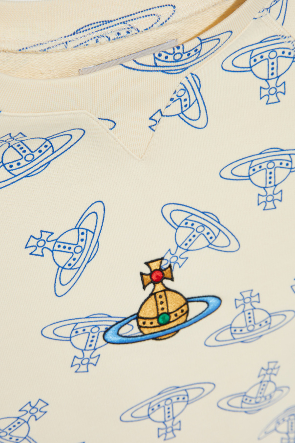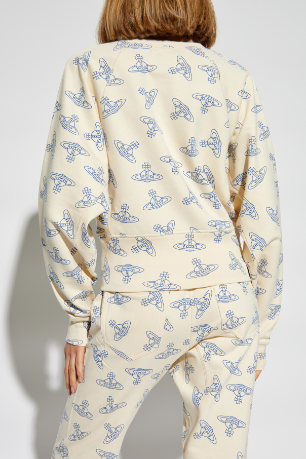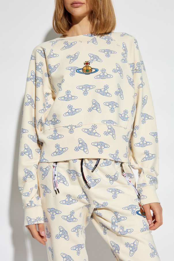 Introducing the Vivienne Westwood Cream Space Odyssey Sweatshirt, a beacon of cosmic elegance and sustainable fashion. This exclusive piece, crafted from 100% organic cotton, offers not only supreme comfort but also a bold statement with its unique interstellar motif. The cream-colored base serves as the perfect canvas for the intricate designs of planets and spacecraft, rendered in captivating shades of blue. The centerpiece of this garment is a vibrant, detailed appliqué or embroidery depicting a satellite or spacecraft against a planetary backdrop, embellished with star-shaped elements, positioned artfully at the chest. The sweatshirt's classic cut, featuring a rounded neckline and snug ribbed cuffs at the sleeves and hem, complements its striking design. Matching joggers, adorned with the same celestial pattern and equipped with ankle cuffs and a drawstring waist, complete this luxurious loungewear ensemble. Why Purchase This Product? Eco-Friendly Material: Made with 100% organic cotton, promoting environmental sustainability. Exclusive Design: Stand out with a distinctive space-themed pattern and central appliqué, a testament to Vivienne Westwood's innovative vision. Versatile Ensemble: A perfect blend of comfort and style, suitable for both casual outings and cozy days at home. Brand Recognition: A part of an exclusive collection from the renowned designer Vivienne Westwood, known for her commitment to combining fashion with activism.