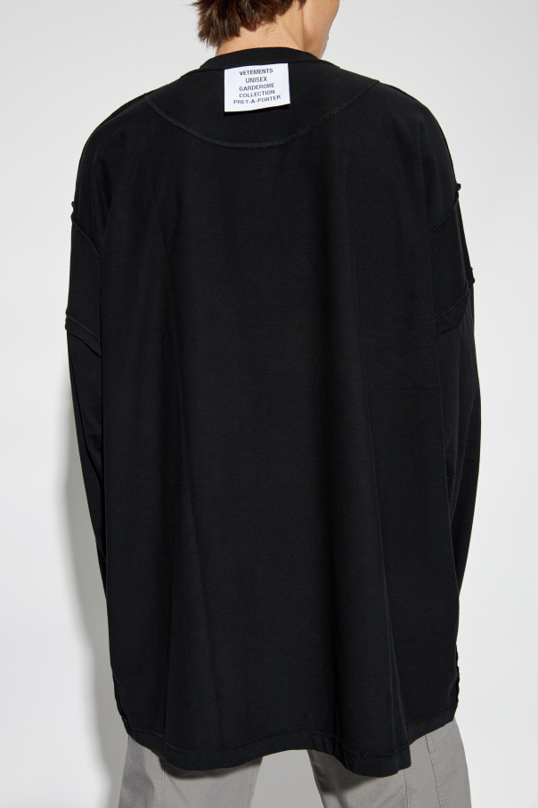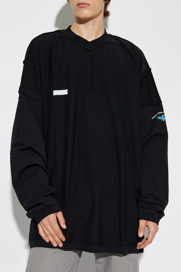 Introducing the Logo T-shirt from the exclusive collection by VETEMENTS, an embodiment of understated elegance and sophisticated casualwear. Crafted from the finest 100% cotton, this black T-shirt features a classic, straight cut with long sleeves, offering a relaxed, slightly oversized fit. The soft, comfortable material makes it an ideal choice for everyday wear, while the V-neckline adds a touch of refinement and can subtly elongate the silhouette. Subtle yet distinctive details elevate this piece: a small white rectangle adorns the left chest, possibly a logo or label, and the left sleeve boasts a print with "One size fits most" and a small blue airplane logo. A rectangular white label on the back neck adds a final, understated touch. Why choose this product? Exquisite craftsmanship by VETEMENTS, a renowned name in avant-garde fashion. Luxurious 100% cotton fabric for ultimate comfort. Elegant V-neckline and relaxed fit, perfect for modern casual style. Unique, subtle detailing that enhances the exclusivity of the piece.