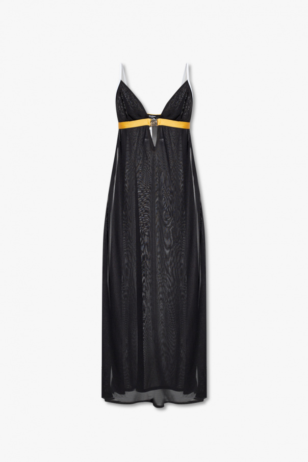 Black beach dress with shoulder straps from Balmain. Crafted with a semi-sheer finish, this style features a relaxed silhouette fitted at the bust with a yellow tape, a logo-engraved buckle and side slits.