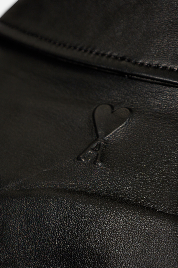 Black jacket from Ami Alexandre Mattiussi. Made of lamb leather, this garment features a two-way zip, two snap-fastened pockets, tactile logo at the back, collar and ribbed trims at the hem and cuffs.