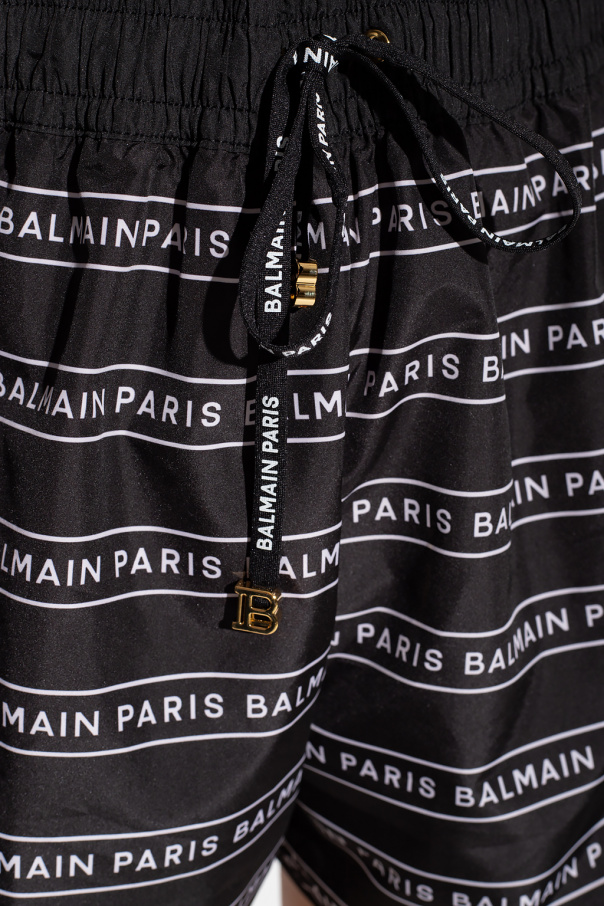 Black swim shorts from Balmain. Fastened with drawstrings, this pair is complete with an elastic waistband and a white logo print.