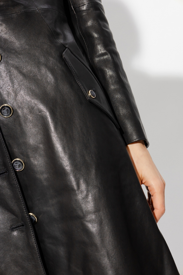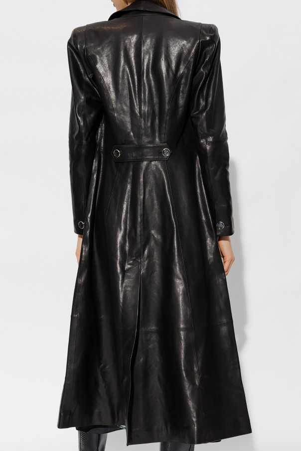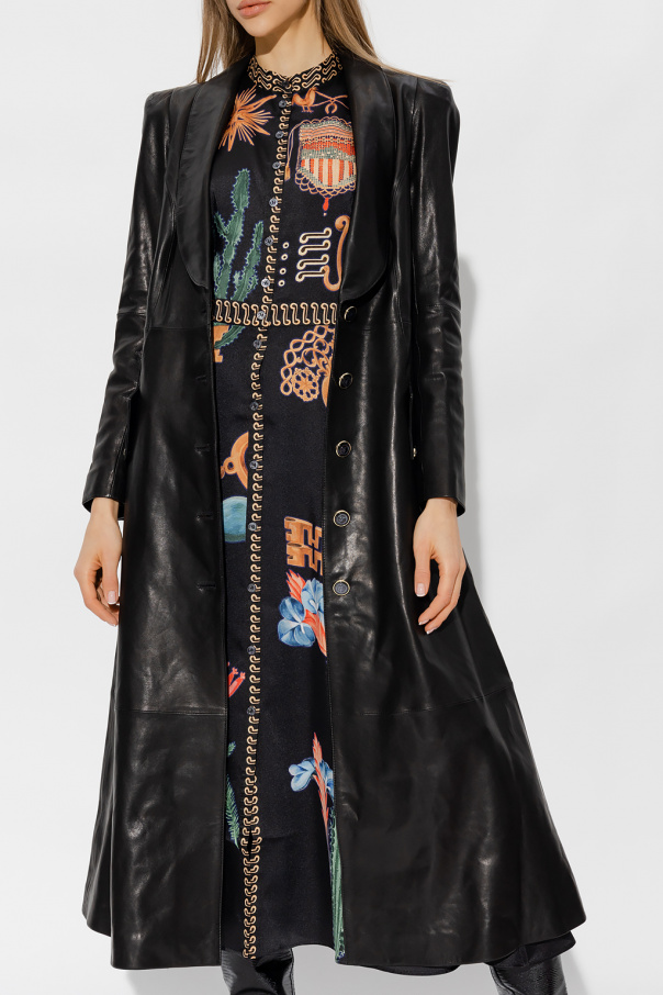 Black ‘Paso’ leather coat from Temperley London. Made of leather, this style features button fastenings, shawl lapels, two flapped pockets, long sleeves, padded shoulders and a single back vent.
