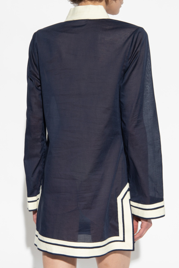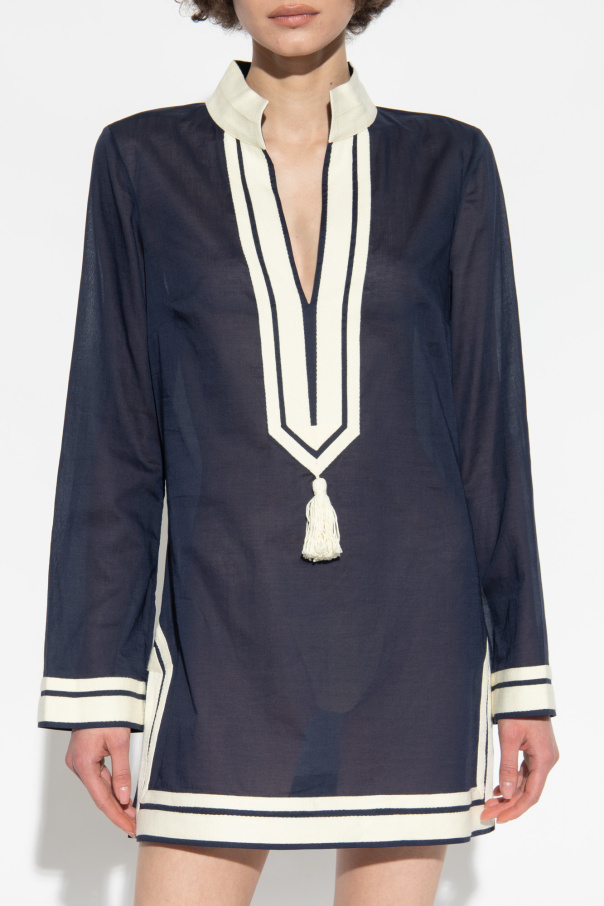 Navy blue tunic from Tory Burch. Made of cotton with a long, relaxed fit, this style features a V-neckline with a mock neck and a tasselled charm on the front. It is complete with cream taping, side bottom slits and long sleeves with cuffs.