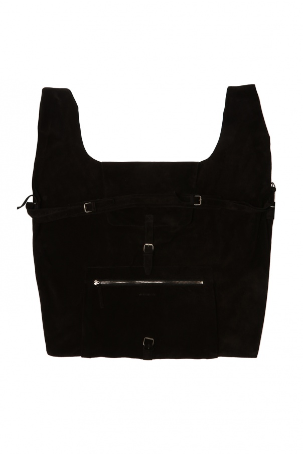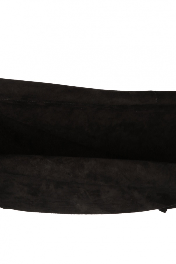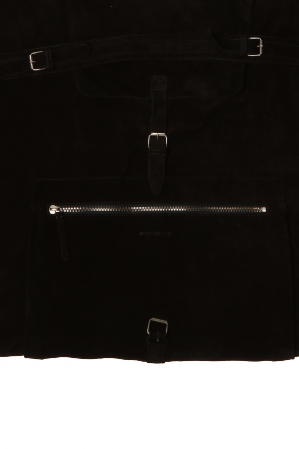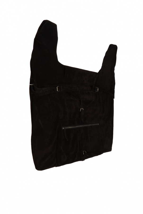 Black shoulder bag from Ann Demeulemeester. Made of suede. Fastened with a buckle strap. Zip pocket on the front. Adjustable shoulder strap. Two half-round handles. Main internal compartment with a zip pocket.