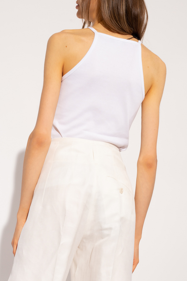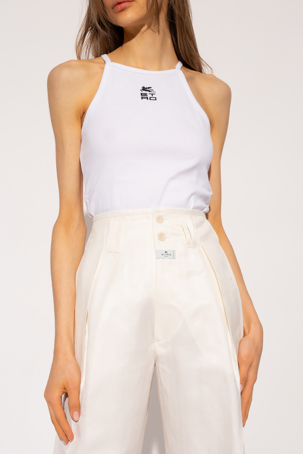 White tank top from Etro. Crafted from cotton, this style showcases a square neckline and black graphic embroidery with a Pegasus motif and the ‘Etro Cube’ logo.