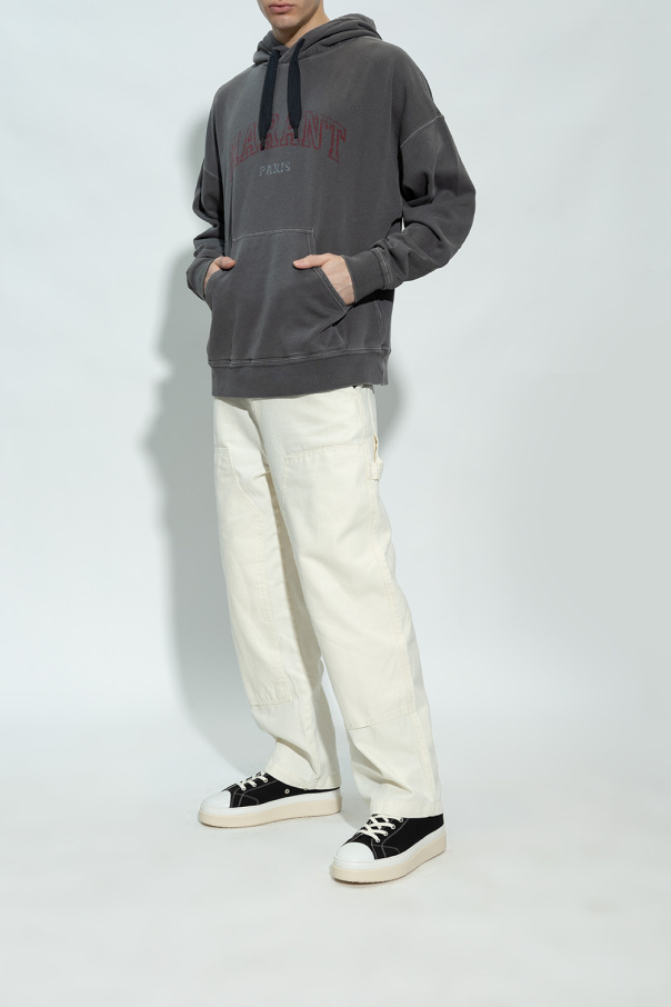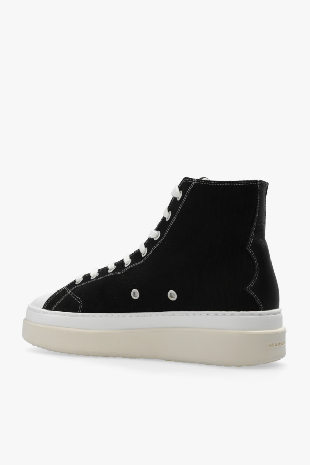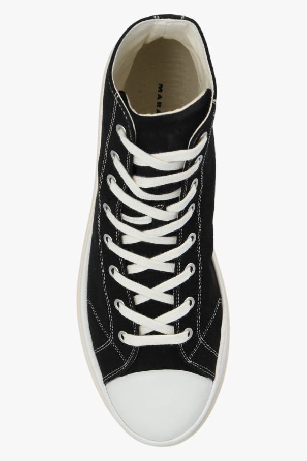 Black and white ‘Austen’ high-top sneakers from MARANT. Made of cotton, this lace-up pair features a logo detail and rubber sole in cream and white.