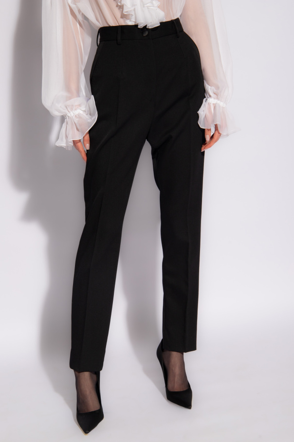 Black trousers from Dolce & Gabbana. Made of a wool and silk blend, this pair falls with slightly tapered legs and features a zip fly with a button, four slip pockets and glossy panels down the sides.