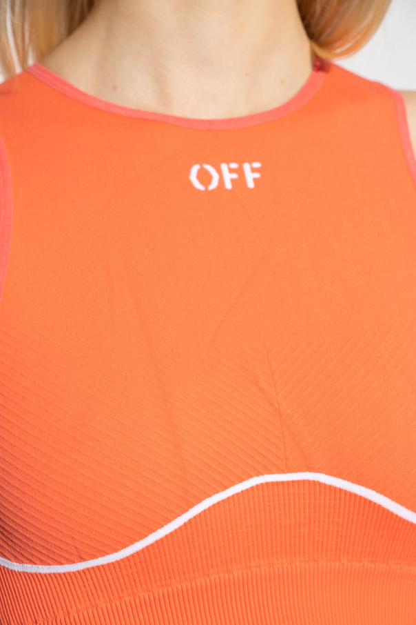 Orange sports tank top from Off-White, the ‘Active’ line. Enriched by a white logo on the front and back, this style features a round neck and an elasticated bottom hem.