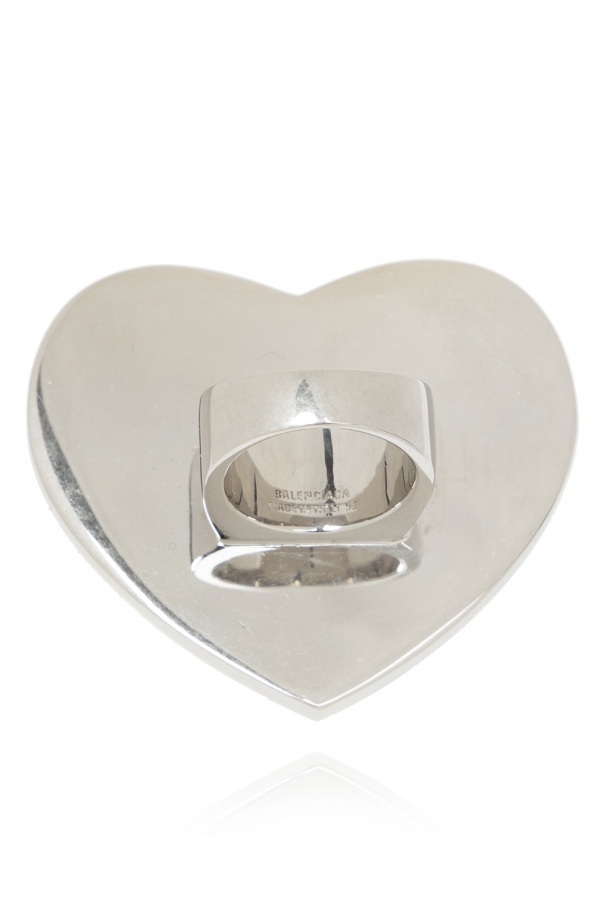 Black and silver-tone ring with a heart motif from Balenciaga. This piece comes decorated with a logo pattern embellished with white crystals.