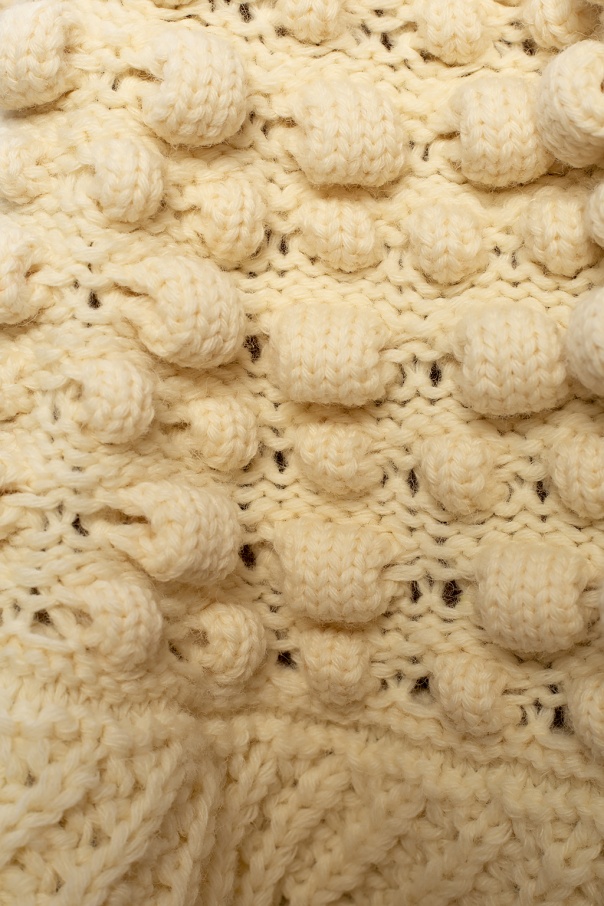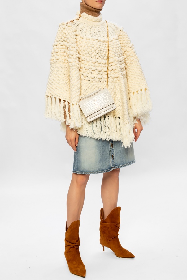 Cream poncho from Saint Laurent. Crafted from wool, this style fastens via buttons and features fringe detailing and embroidered distinctive appliqués.