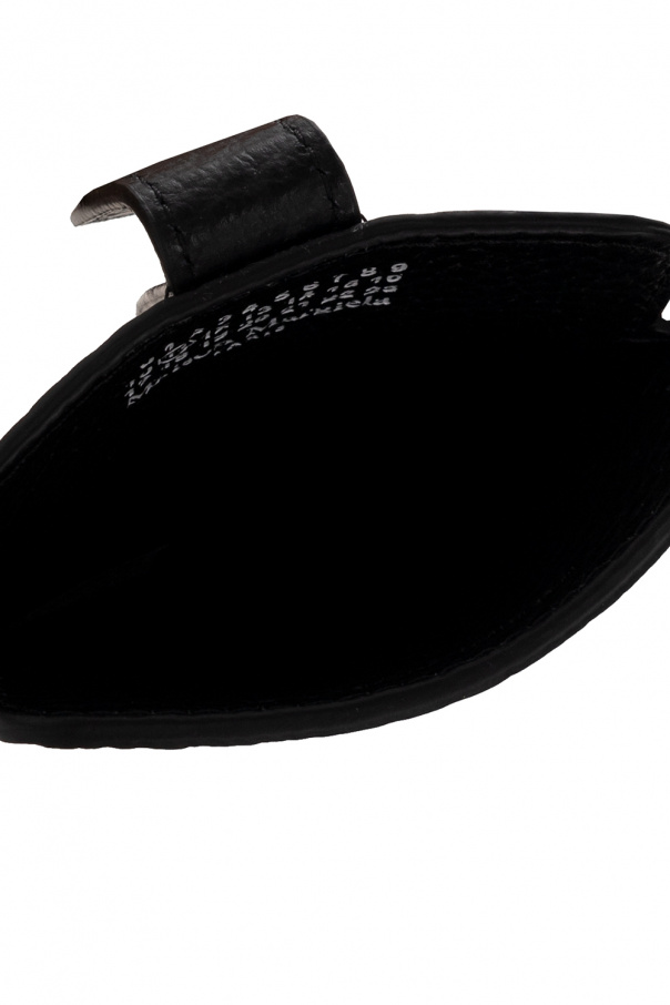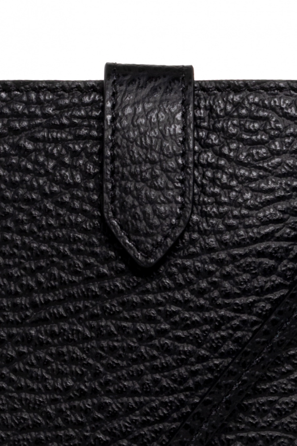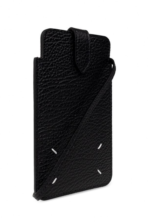 Black phone case from Maison Margiela. Made of calf leather, this model features a snap closure, white logo embroidery, detachable and adjustable shoulder strap, one internal compartment and silver-tone metal hardware.