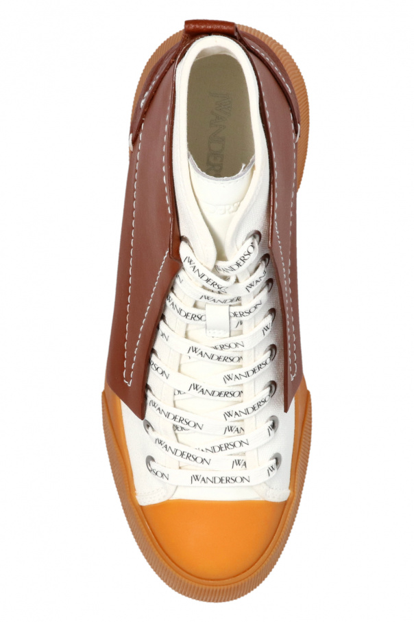 Brown and cream high-top sneakers from JW Anderson. Trimmed with leather, this lace-up pair features a logo embossed on the tongue and a beige rubber sole.
