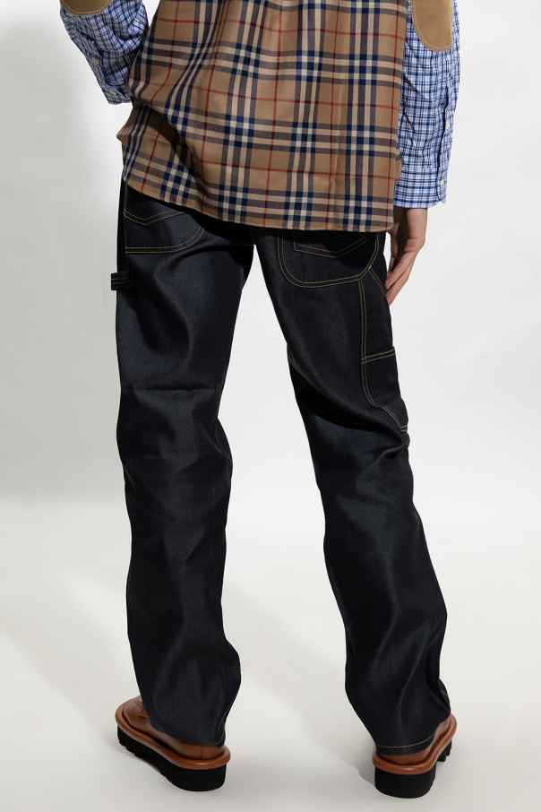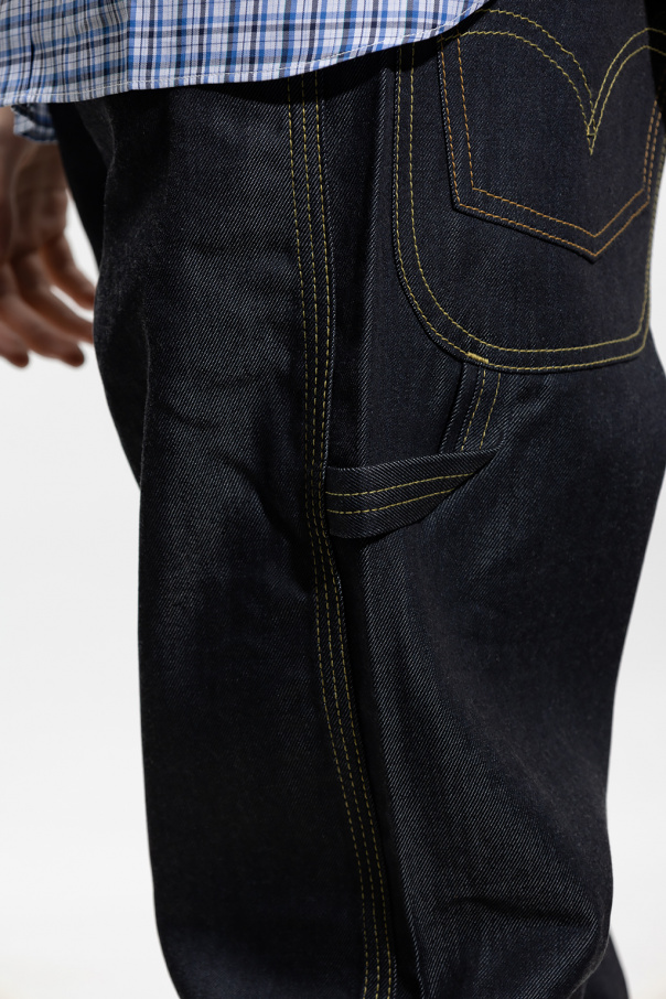 Navy blue ‘503’ jeans from Junya Watanabe Comme des Garcons x Levis. Falling with slightly tapered legs, this pair features a zip fly with a button, multiple pockets and beige stitching details.
