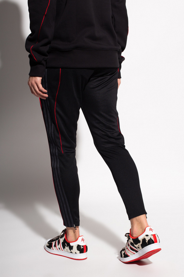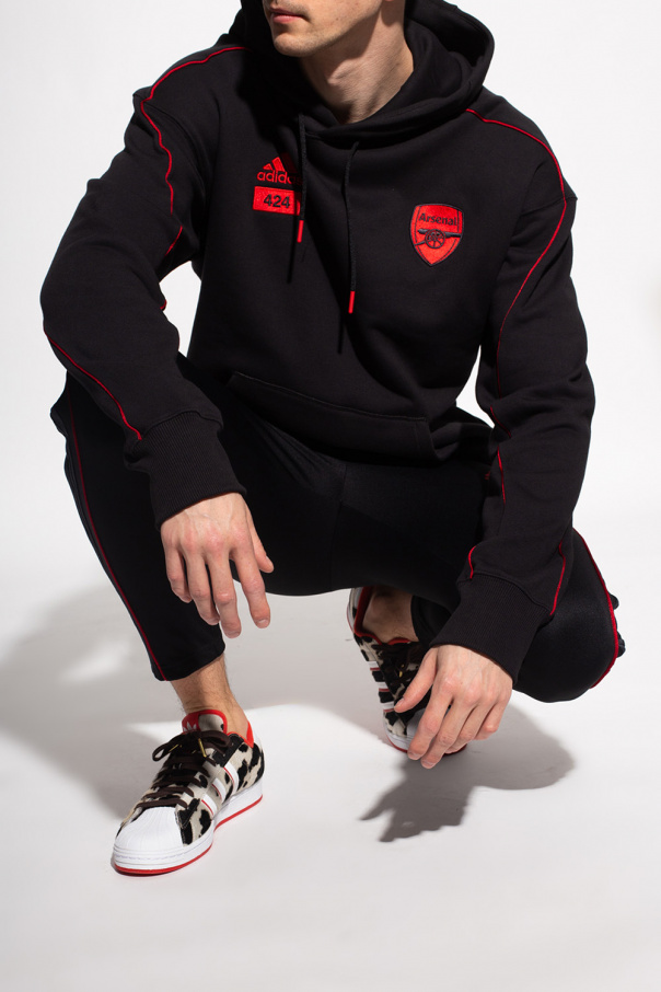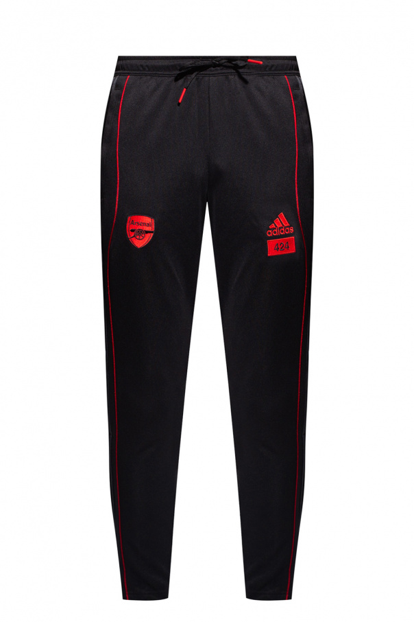 Black sweatpants from ADIDAS Performance x Arsenal F.C. X 424, ‘Primegreen’ line. Fastened with drawstrings, this straight leg design features a red logo embroidery, two zip pockets, zipped cuffs and the iconic three stripes. ADIDAS and 424 have teamed up for a capsule collection representing the colors of the London-based Arsenal Football Club that is also a nod to the architecture of its Emirates Stadium home. The collection is showcased in a lookbook featuring current Arsenal stars Alexandre Lacazette, Willian and Gabriel. ‘Primegreen’ is a line that uses recycled materials in the production of high-quality products.