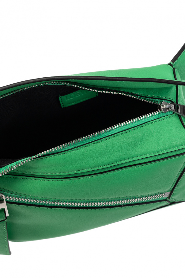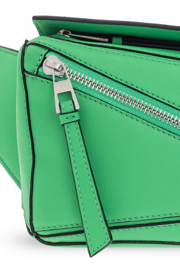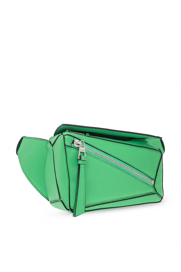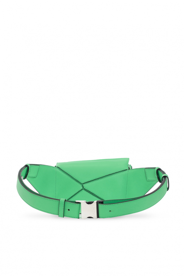 Green ‘Puzzle Mini’ belt bag from Loewe. Made of calf leather, this model features a zip fastening, embossed logo, front zip pocket, adjustable belt and silver-tone metal hardware.