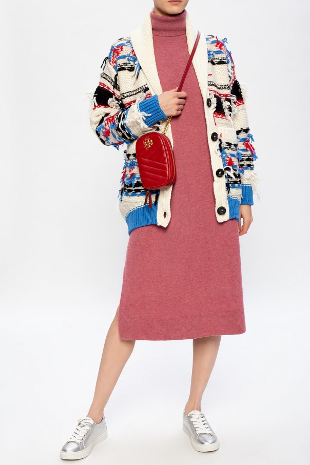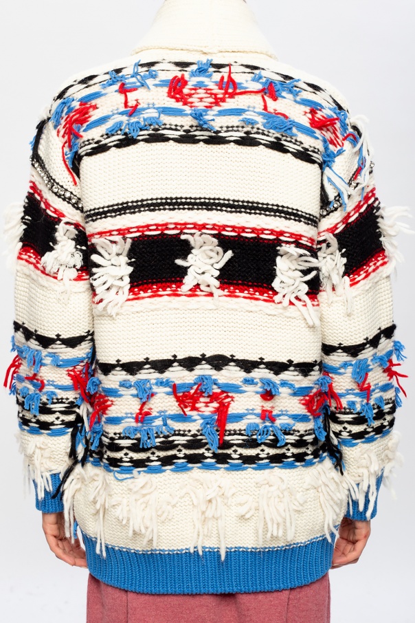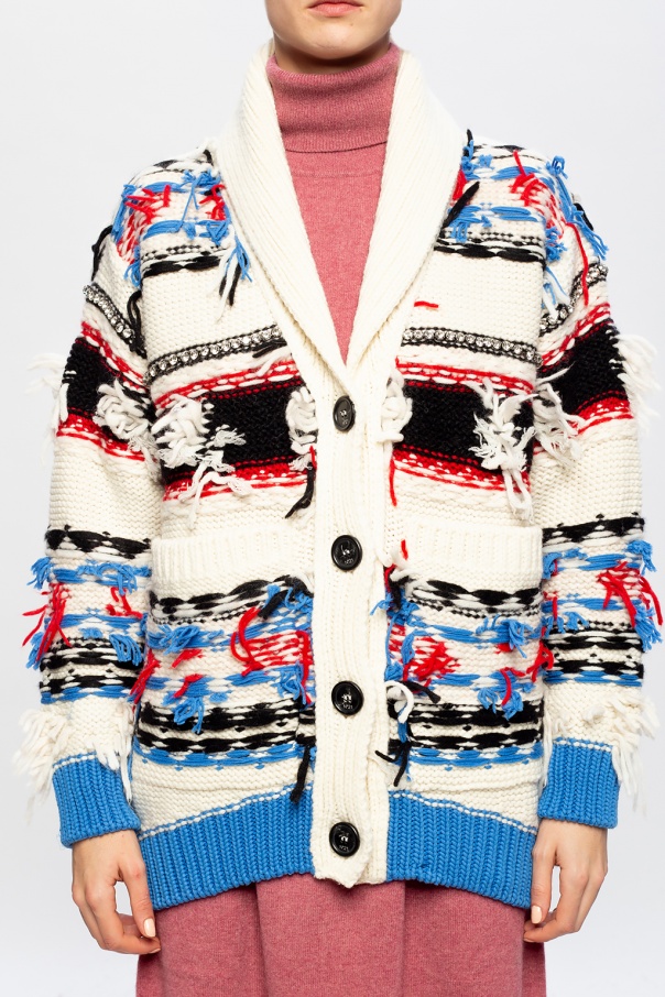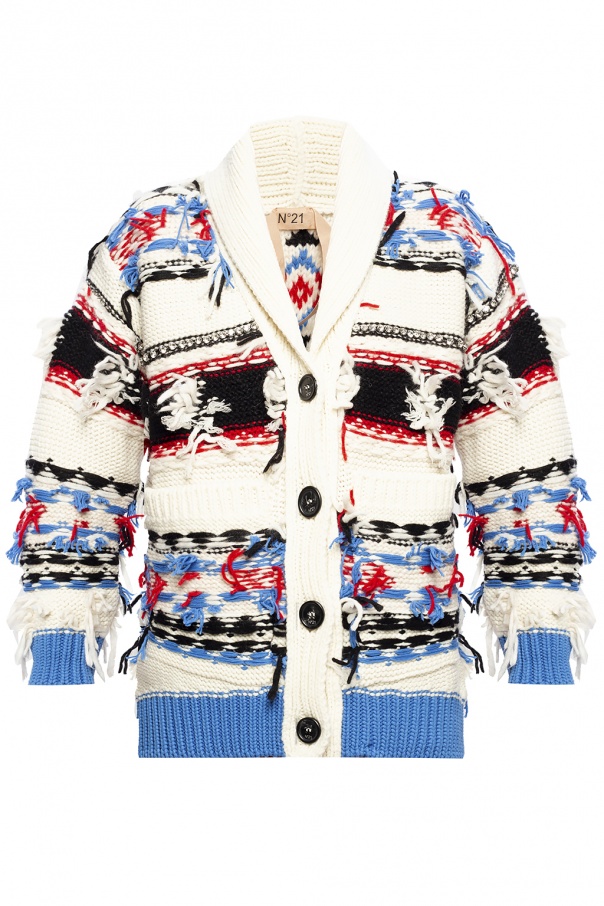 Multicoloured V-neck cardigan from N21. Knitted from ribbed fabric blend, including wool, this long-sleeved garment fastens via buttons and showcases two welt front pockets as well as decorative fringe detailing and glass beads.