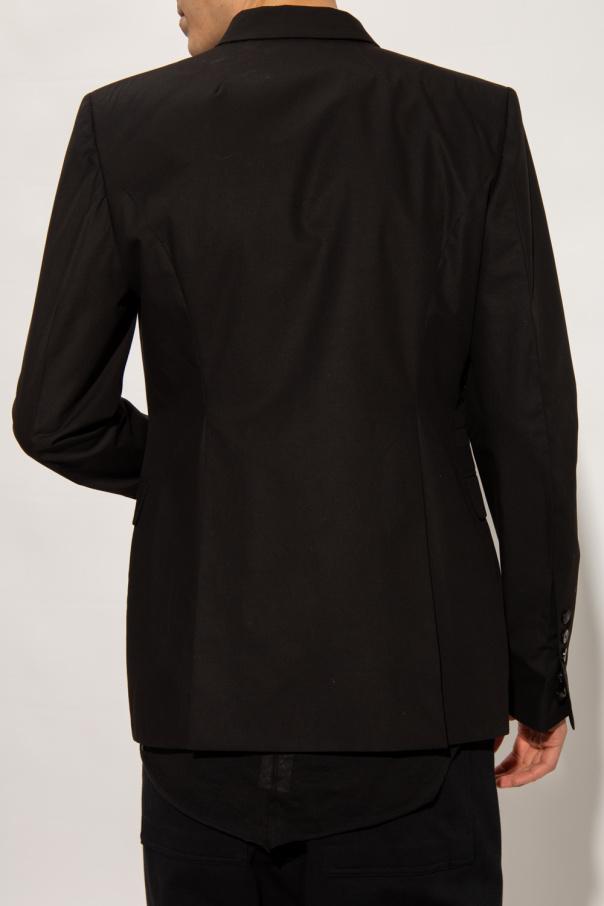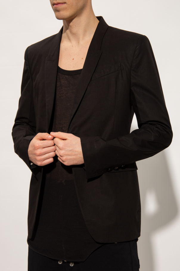 Black blazer from Rick Owens. Made of cotton, this style features a single button closure, peak lapels, two slip pockets, two flapped pockets, long sleeves and a double back vent.