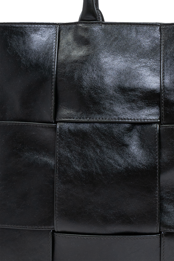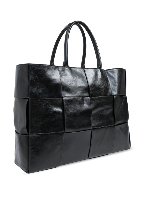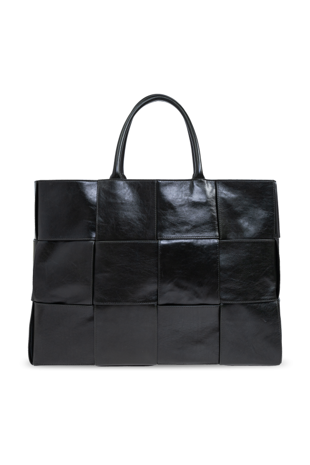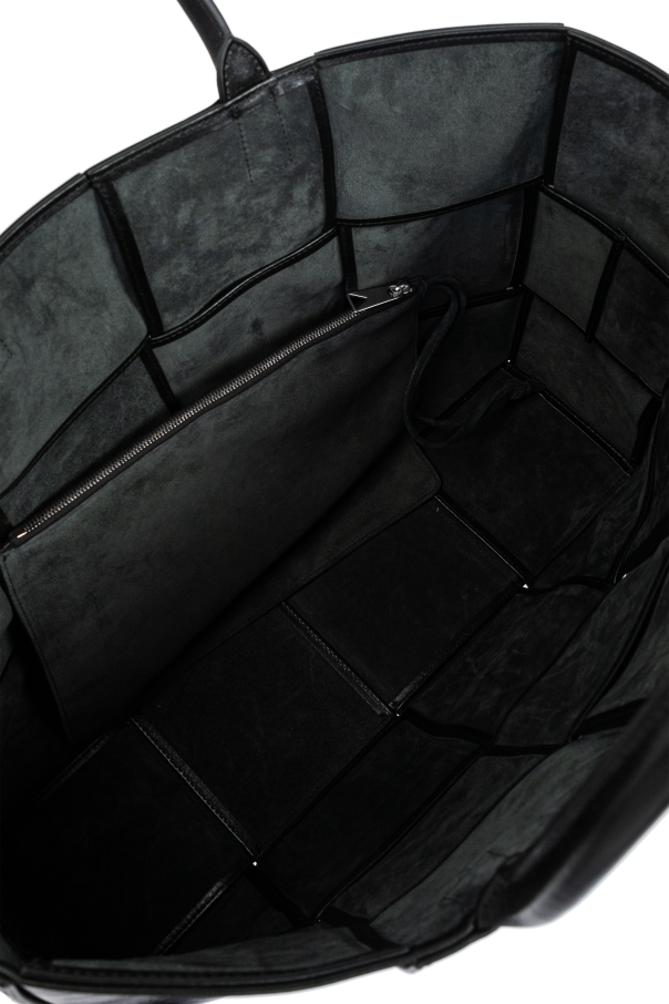 Introducing the Arco Large Shopper Bag by Bottega Veneta, a paradigm of luxury and functionality melded into a stunning piece of accessory artistry. Crafted with meticulous attention to detail from 100% lambskin leather, this bag exudes a sophisticated aura with its unique dark green hue and natural grain texture. The surface is adorned with a distinctive mosaic pattern, achieved through intricately stitched vertical and horizontal seams, presenting a modern take on classic elegance. The Arco Large boasts a rectangular shape with pronounced edges and a flat bottom, ensuring stability and an upright posture. Its dual parallel handles offer versatility, allowing for comfortable carrying in hand or on the forearm. The bag features a capacious main compartment, secured with a zipper, and an interior furnished with smaller pockets and a detachable zipped pouch, ideal for organizing essentials. The absence of conspicuous logos underscores Bottega Veneta's commitment to discreet luxury and minimalist design. Why Purchase This Product? Exemplary craftsmanship from 100% lambskin leather, promising durability and a premium feel. Unique mosaic pattern and sophisticated dark green color for standout elegance. Versatile carrying options with sturdy handles, suitable for various occasions. Spacious interior with secure compartments, offering practical storage solutions. Signature of discreet luxury with minimalist branding, aligning with Bottega Veneta's design ethos.