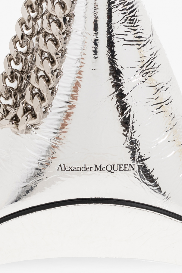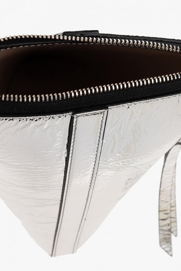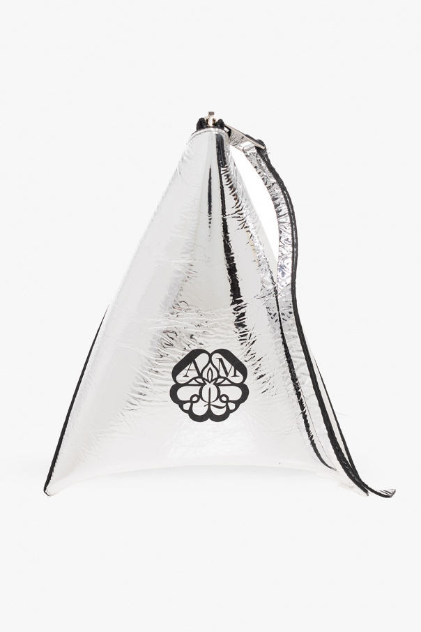Silver-tone ‘The Curve Pouch’ handbag from Alexander McQueen. Crafted from calf leather with a metallic finish, this model features a zip fastening, Seal Signature on one side, black logo print on the other side, wrist chain, one internal compartment and silver-tone metal hardware.