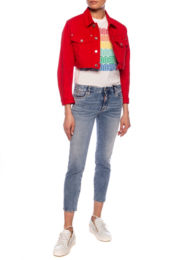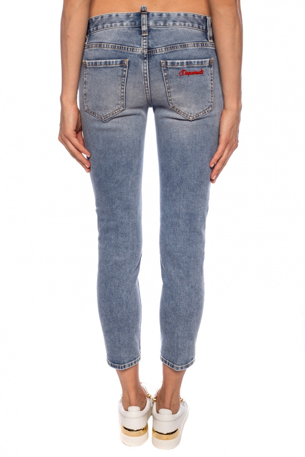 Blue ‘Cropped Twiggy Jean’ distressed jeans from Dsquared2. Zip and button fastening. Two slip pockets on the front, two at the back. Decorated with a red logo applique. Tapered legs.