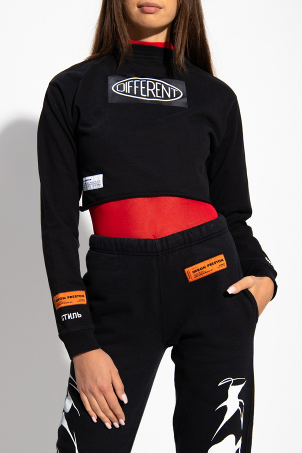 Black cropped T-shirt from Heron Preston. Made of organic cotton, this long sleeve design features logo patches, a white print at the back, raw-trimmed hem and ribbed trims at the neck and cuffs.