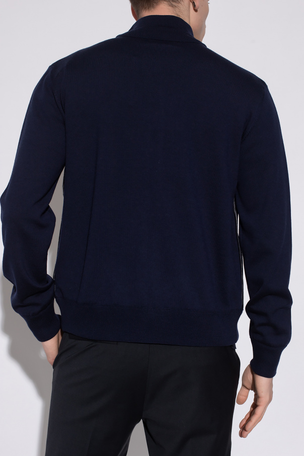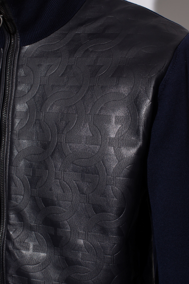 Navy blue and black cardigan from Salvatore Ferragamo. Crafted from wool and calf leather, this style showcases a logo pattern, a zip fastening, two slip pockets and elasticized trims on the standing collar, bottom hem and cuffs.