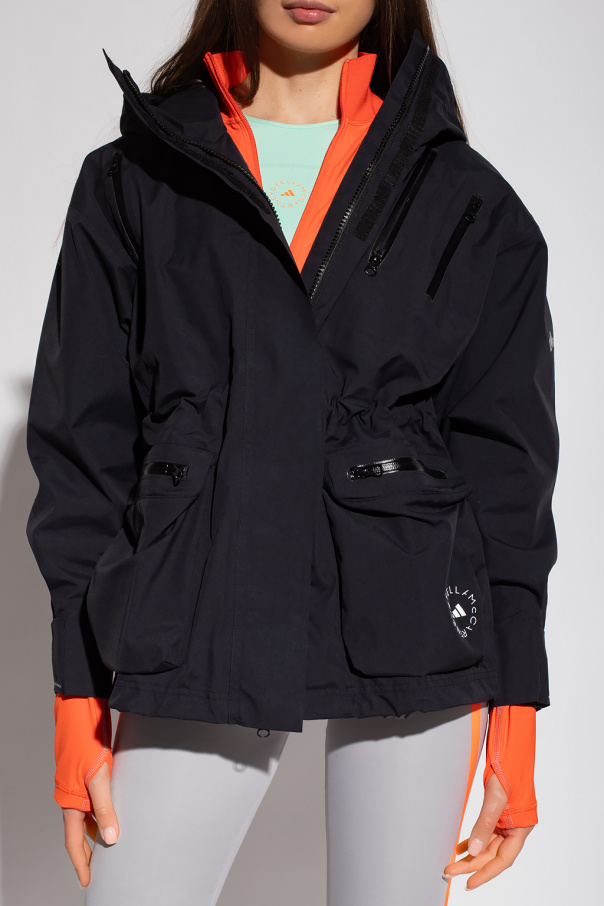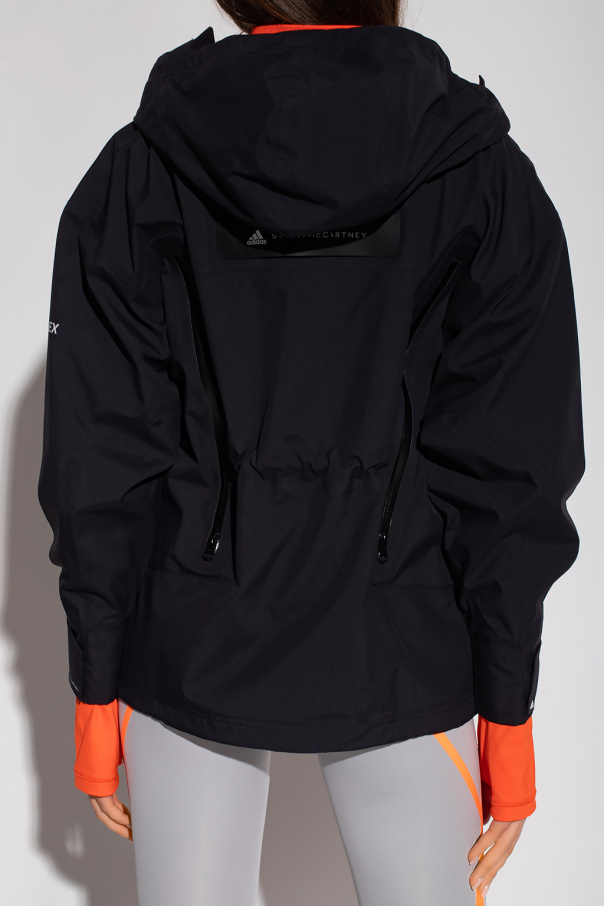Black jacket with a drawcord-adjustable hood from ADIDAS by Stella McCartney, the ‘End Plastic Waste’ line. Crafted from recycled material with the use of GORE-TEX membrane, this style features a relaxed silhouette, a two-way zip and velcro closures on the front, white logo detailing, reflective elements, seven zip pockets and long sleeves with velcro-fastened cuffs.