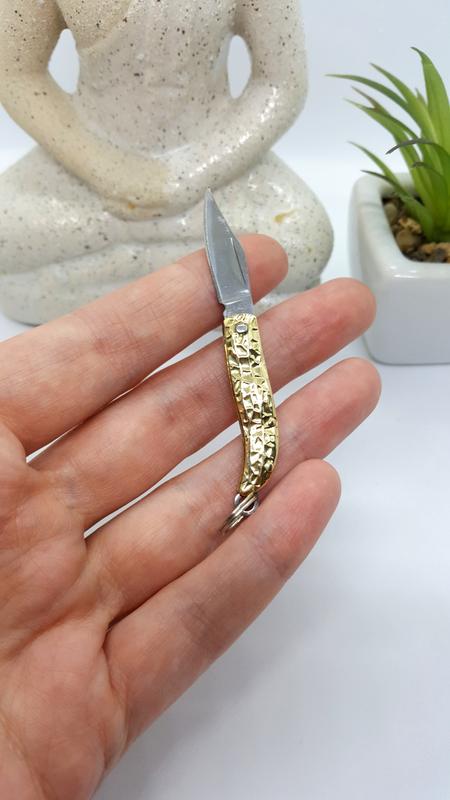 Размер: длина ножа 7 см, размер лезвия 3 см. Размер в сложенном виде 4 см. Кольцо – 1 см.