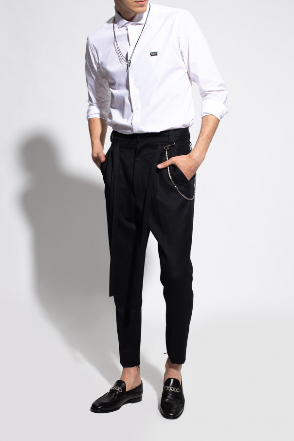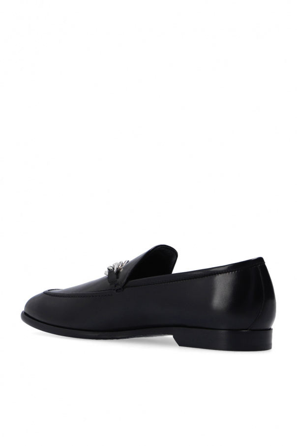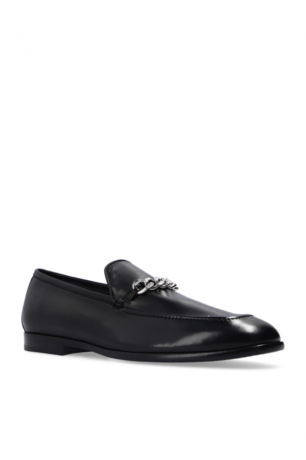 Black ‘Marti’ moccasins from Jimmy Choo. Made of suede, this pair sits on a black leather sole and features a silver-tone chain accessory on the front.