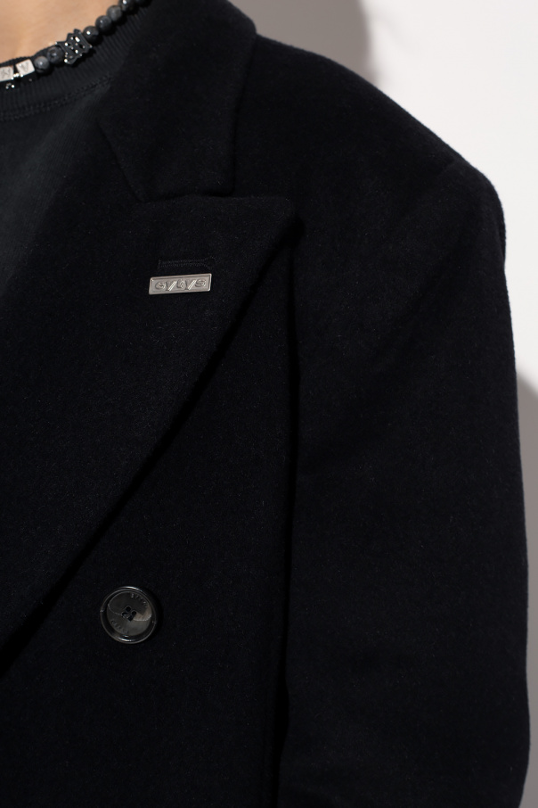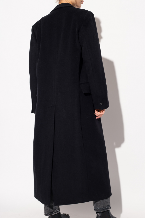 Black double-breasted coat from Eytys. Decorated with a grey logo appliqué, this long sleeve design is complete with peak lapels, two flap pockets and a single rear vent.