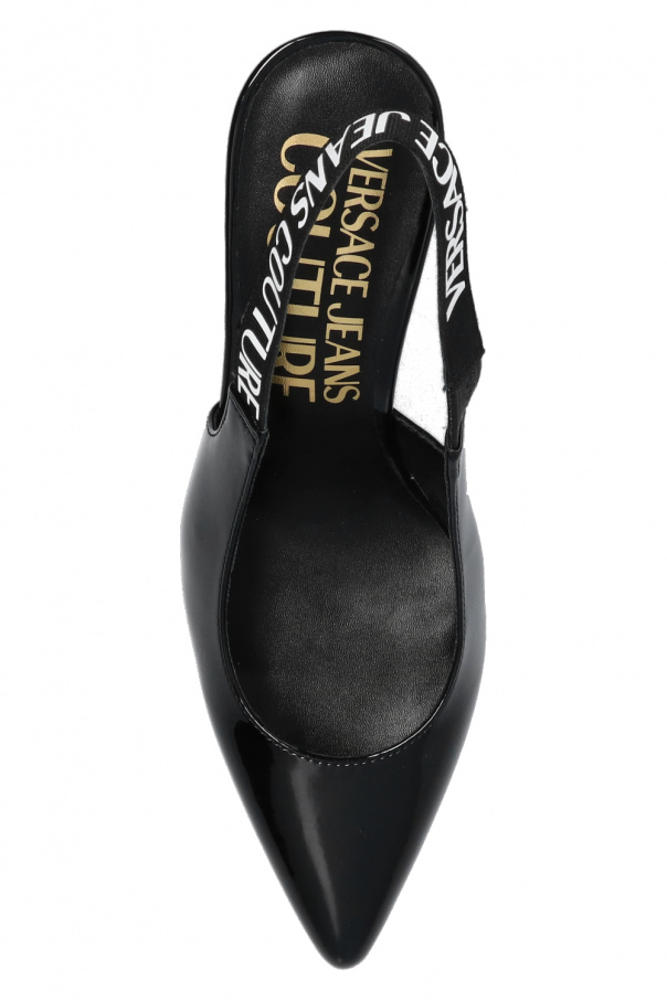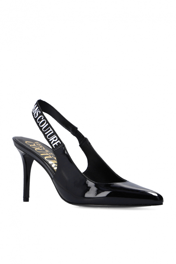 Black sling-back pumps from Versace Jeans Couture. Crafted from textured patent leather, this pointed toe design features a white logo print and black rubber sole.