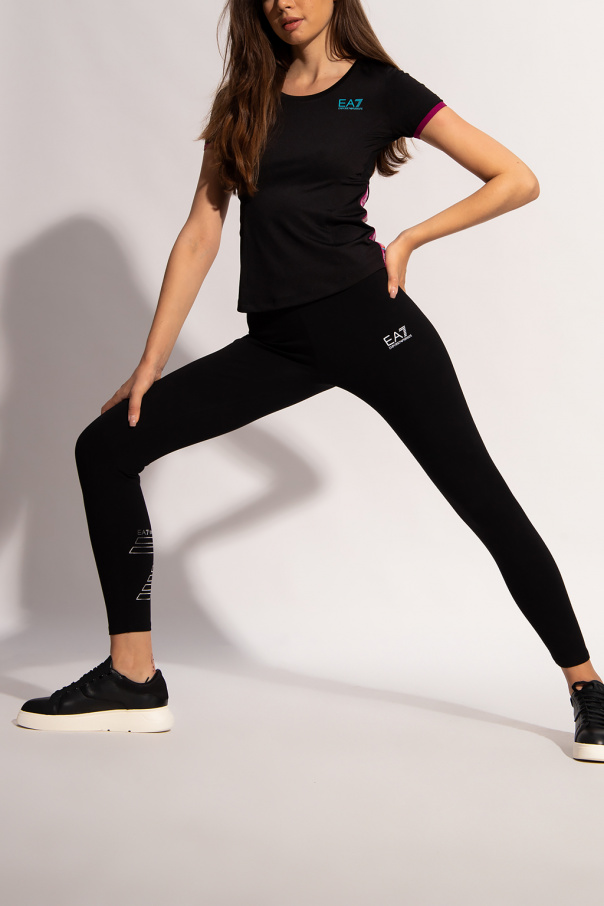 Black T-shirt from EA7 Emporio Armani. This round neck design features a printed logo pattern in blue, purple and white as well as short sleeves with ribbed cuffs.