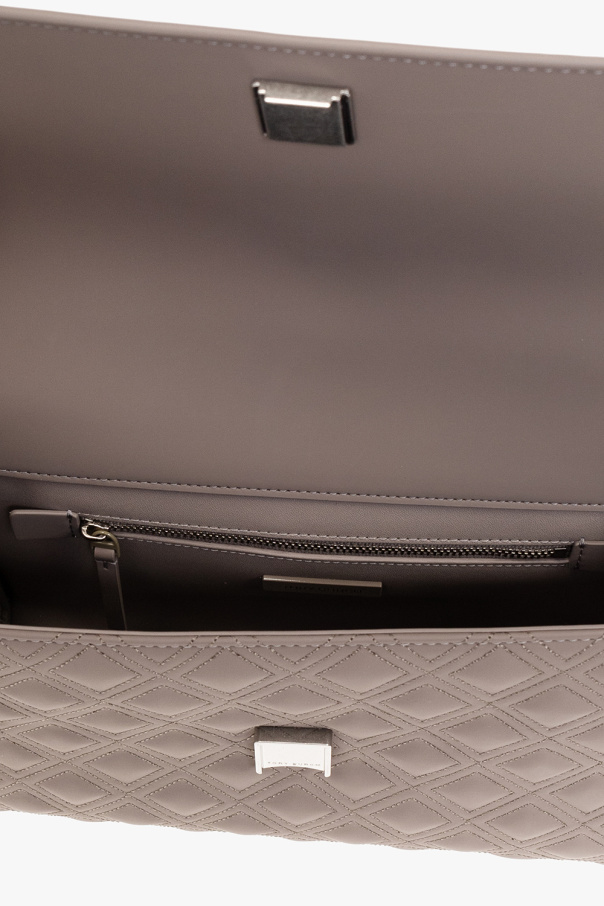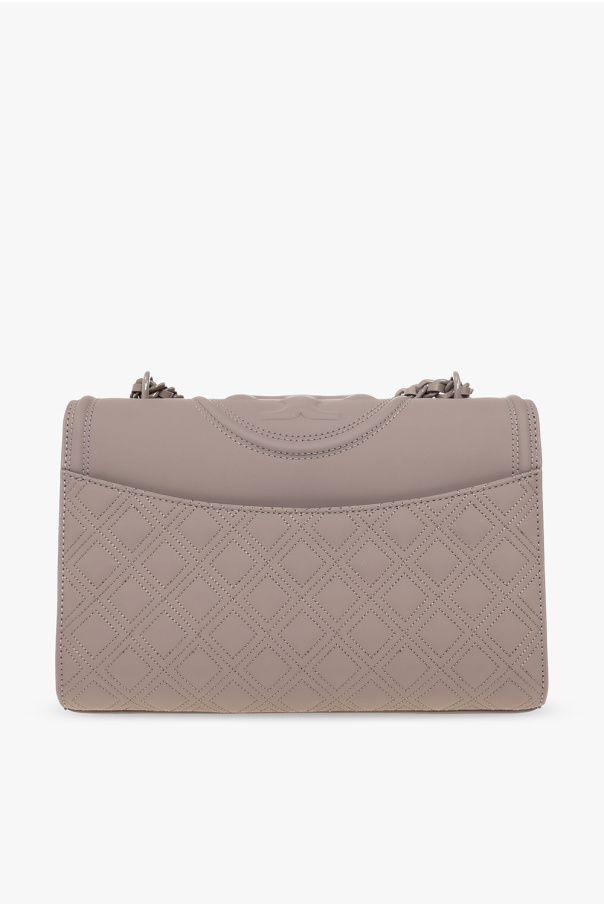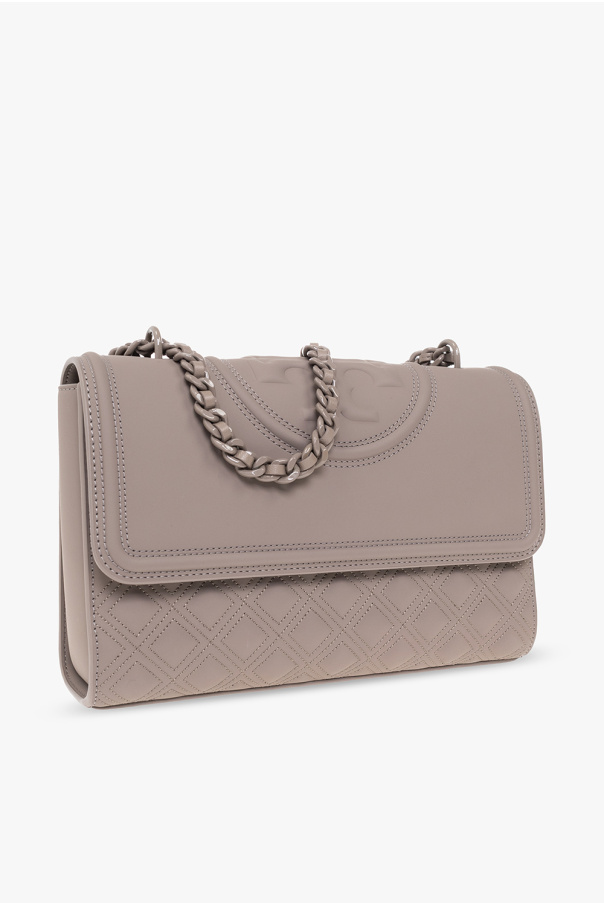 Greyish brown ‘Fleming’ quilted shoulder bag from Tory Burch. Made of faux leather, this model features a flap with a logo and magnetic snap fastening, back pocket, double chain braided with leather, detachable tassel charm, silver-tone metal hardware and one internal compartment with two slip pockets and one zip pocket.