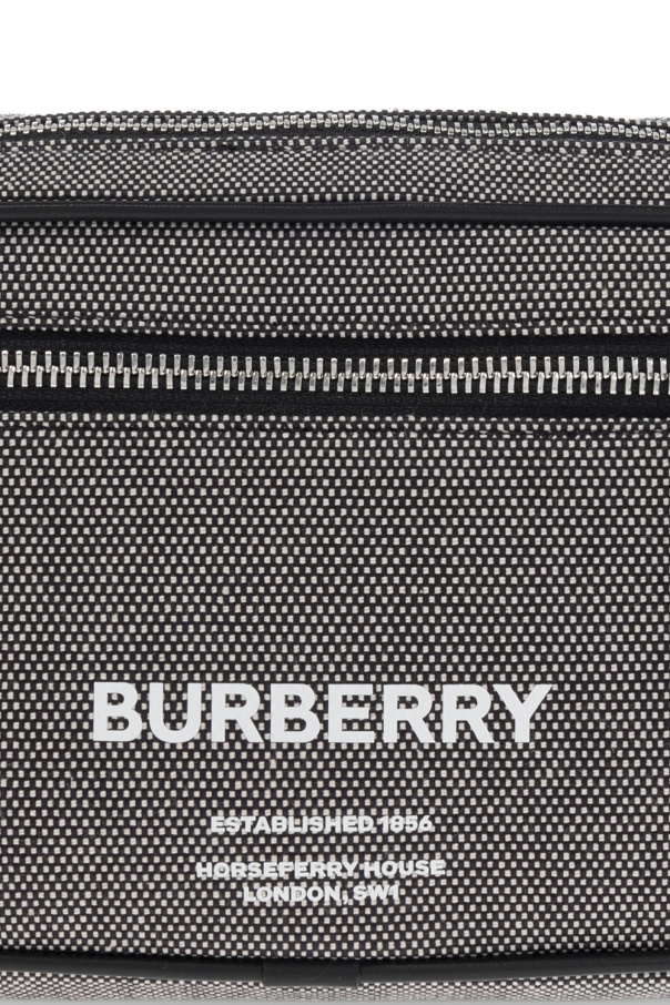 Grey and black ‘West’ belt bag from Burberry. Crafted from cotton canvas, this model features a zip fastening, front zip pocket with a Horseferry logo in white, adjustable shoulder strap, silver-tone metal hardware and one internal compartment with one slip pocket.