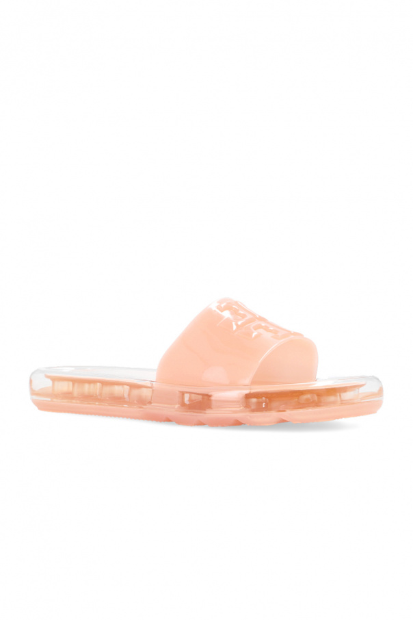Light pink ‘Bubble Jelly’ slides from Tory Burch. Crafted with a transparent finish, this model showcases a raised logo on the front and transparent cream rubber sole at the base.