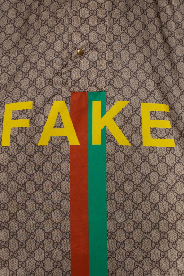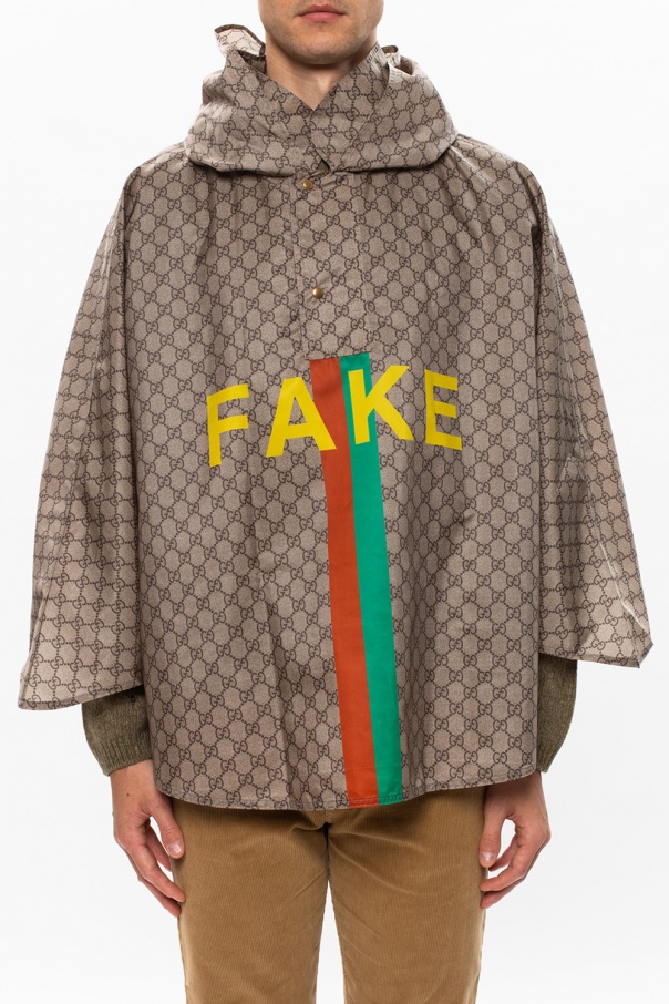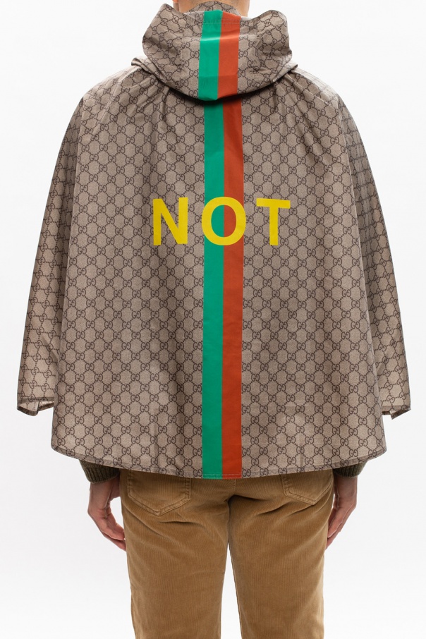 Beige hooded cape from Gucci. Illustrated with GG pattern and colourful graphic print, this style fastens via snap-buttons and it can be folded into the included pouch.