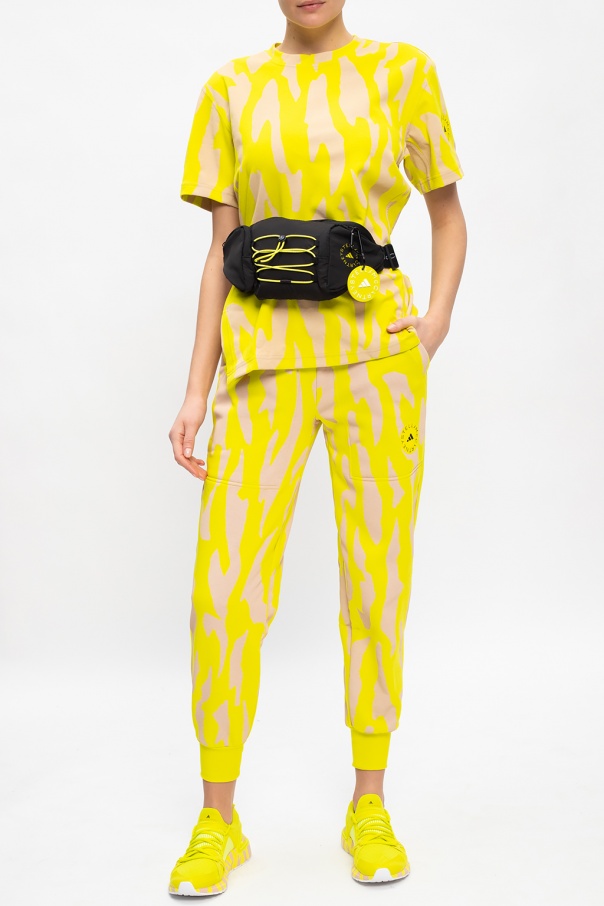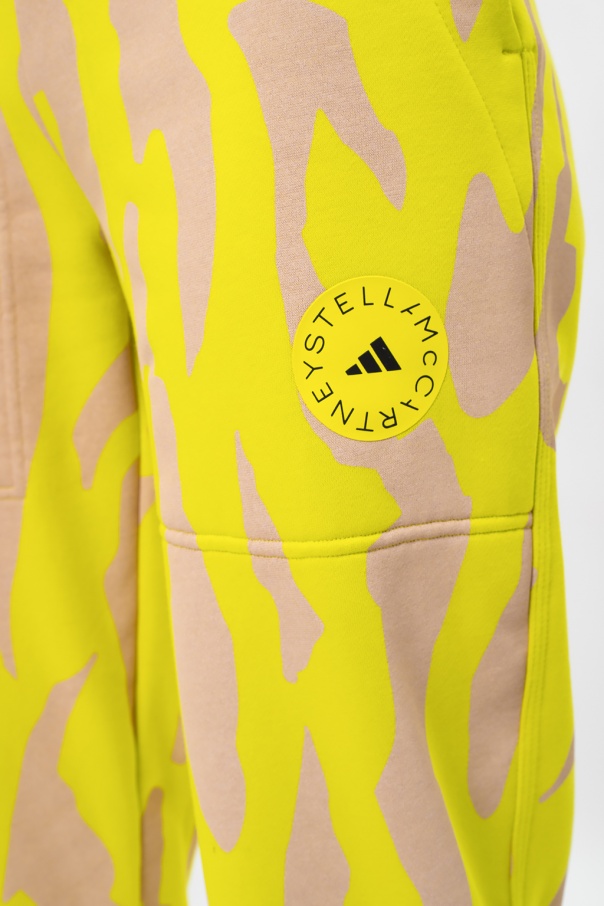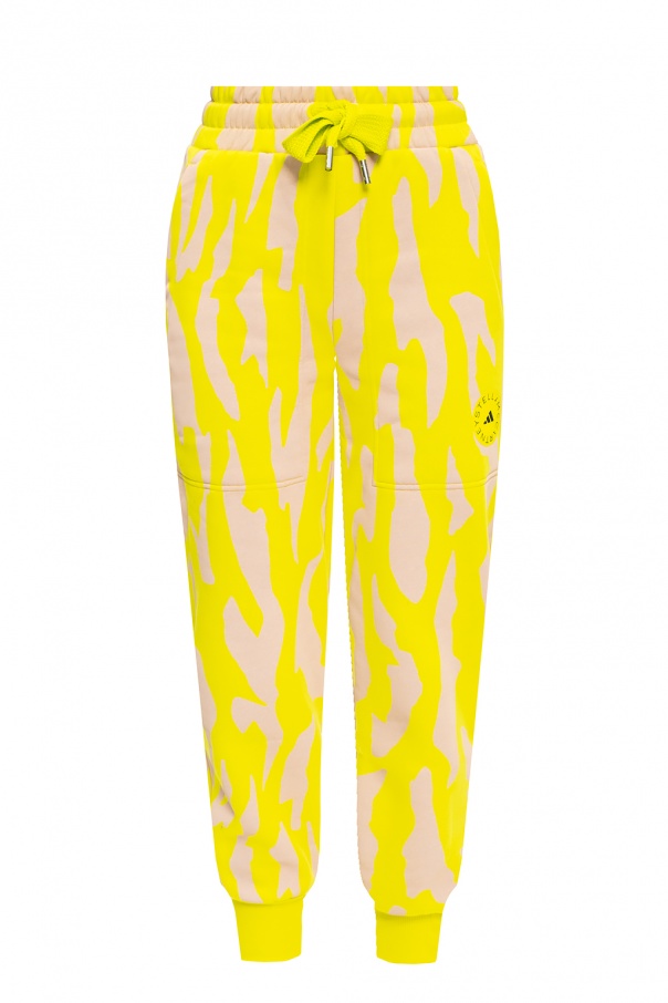 Neon yellow and beige sweatpants from ADIDAS by Stella McCartney. Made of cotton, this design is complete with a drawstring waist, logo patch, two slip pockets and ribbed cuffs.