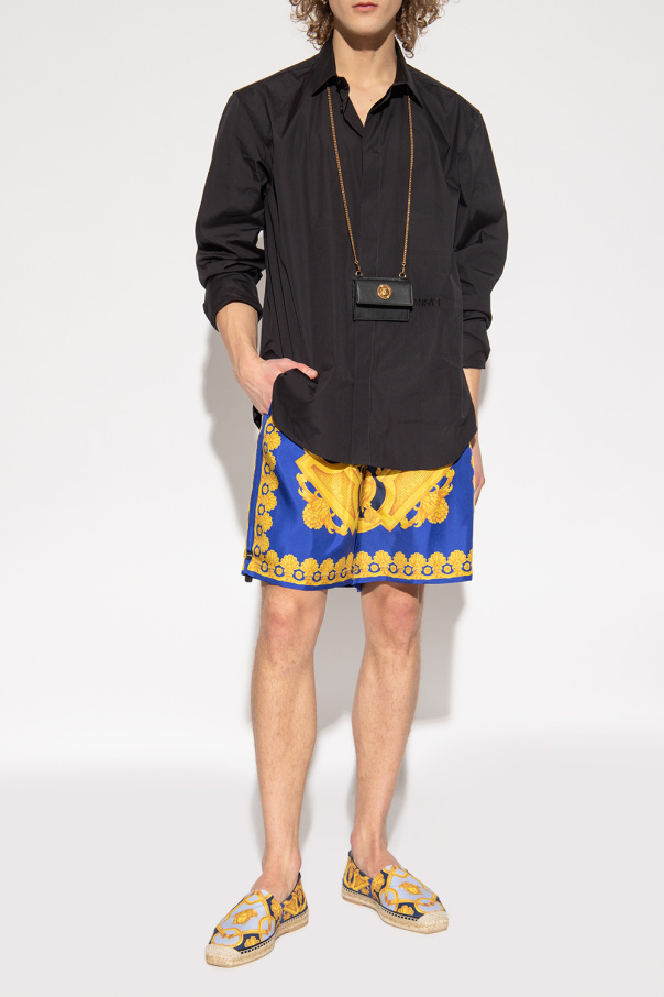 Multicolored espadrilles from Versace. Made of canvas with the brand’s signature Baroque pattern and leather trimming, this pair rests on a sole constructed from woven jute and beige rubber.
