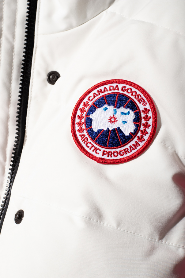 White and black asymmetrical quilted down vest from Canada Goose. Fastened with a zip and snaps, this garment features a red, white and navy logo patch and two zip pockets. Temperature rating: 5°C to -5°C.
