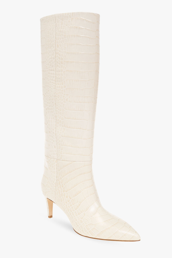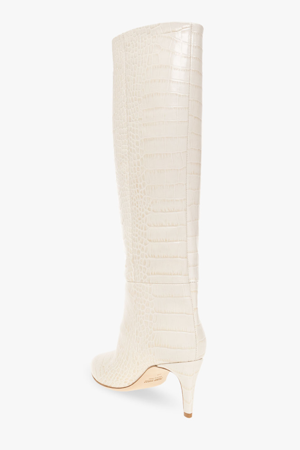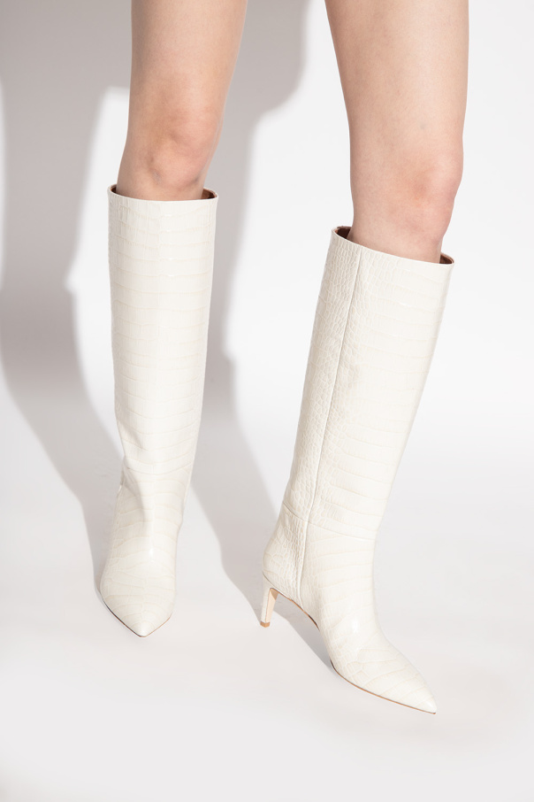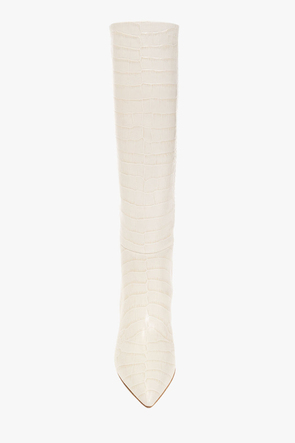 Cream heeled boots from Paris Texas. Crafted from textured leather with a crocodile skin effect, this model features a pointed toe and a beige leather sole.