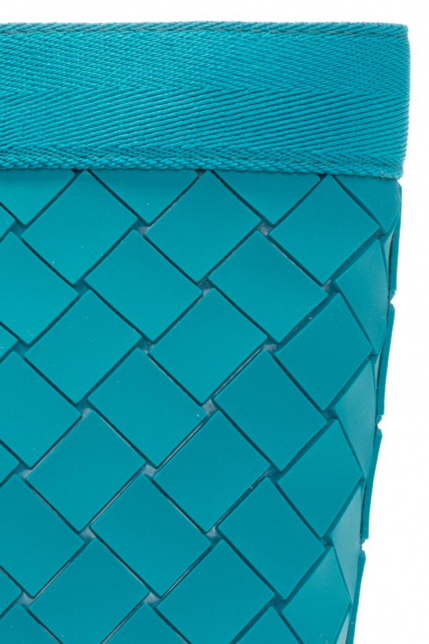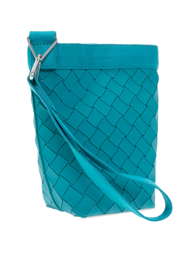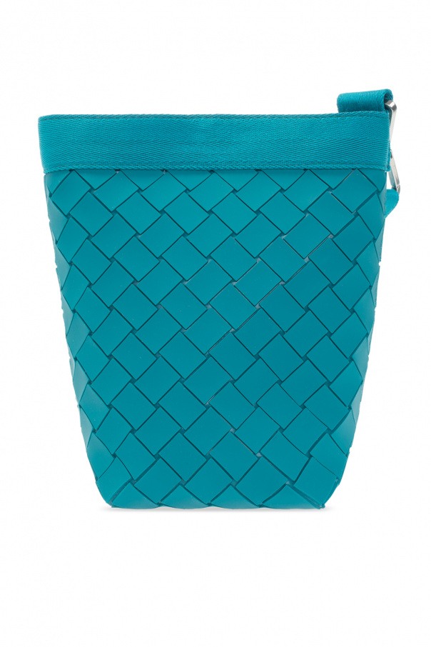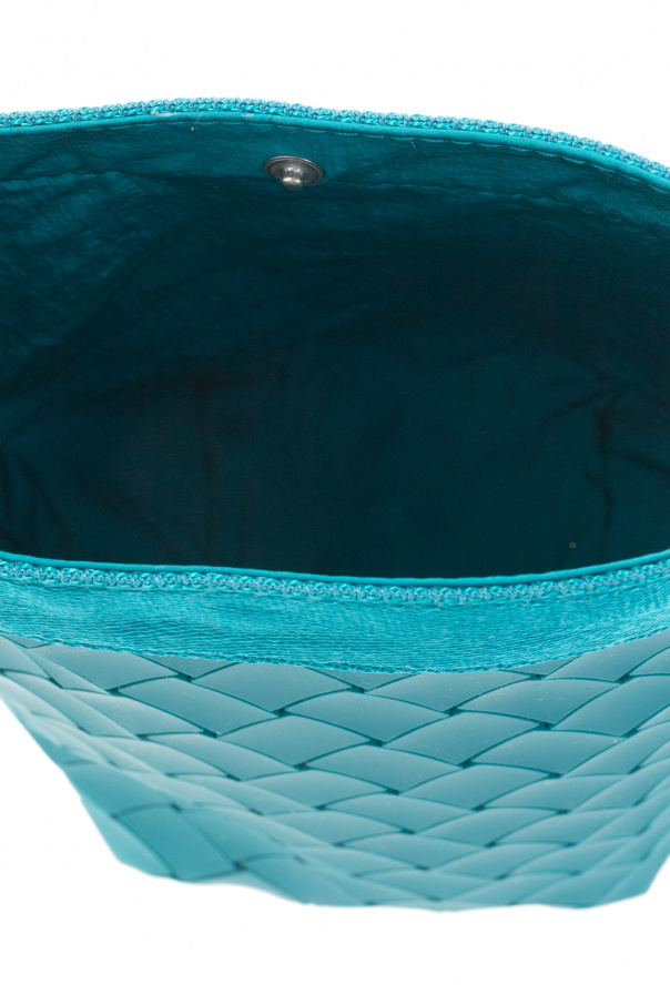 Blueish green handbag from Bottega Veneta. Featuring a pattern inspired by the iconic ‘Intrecciato’ weave, this item is complete with a snap fastening, a detachable wrist strap, silver-tone metal hardware and one internal compartment.
