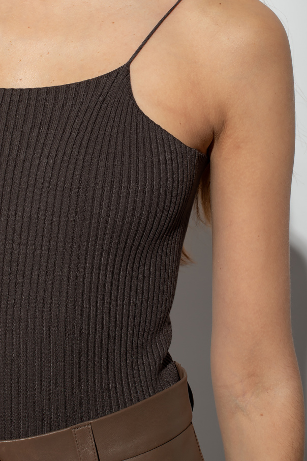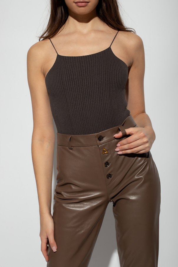 Brown ‘Avedon’ slip bodysuit from Aeron. This style was made of a ribbed knit.