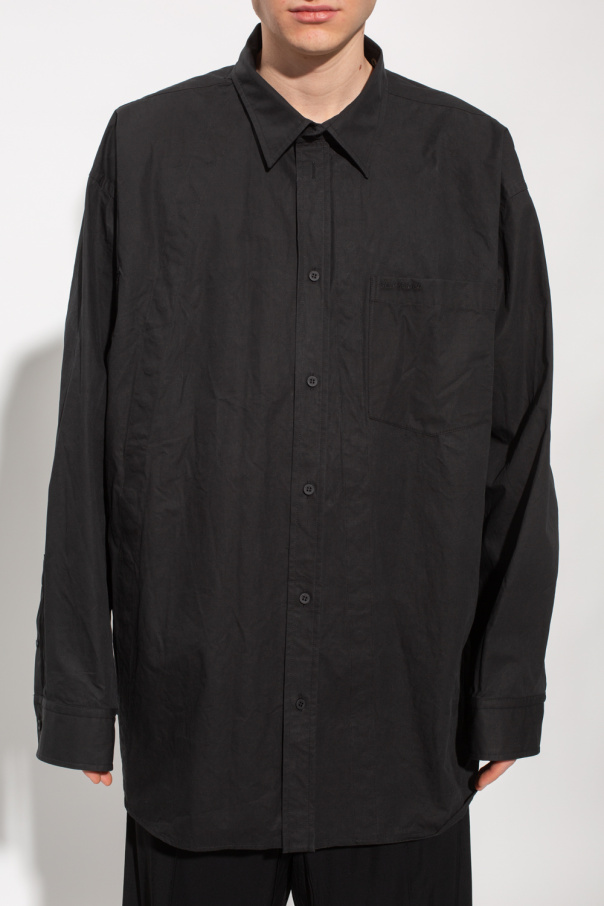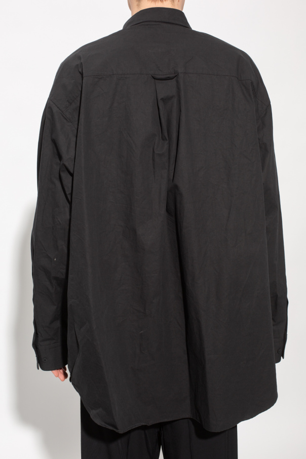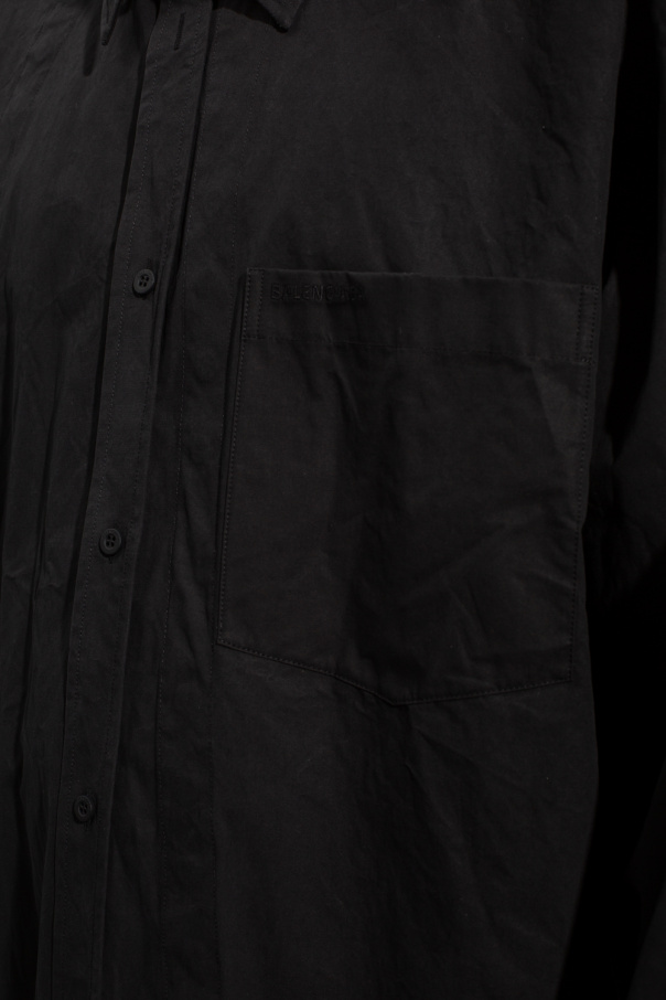 Black ‘Snap’ oversize shirt with a collar from Balenciaga, the ‘Clones Collection’. Made of cotton, this garment features buttons, snaps for different stylings, front pocket with a logo embroidery and long sleeves with button cuffs.