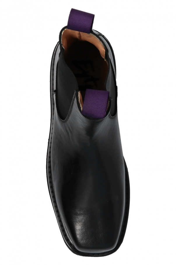Black ‘Ortega’ platform ankle boots from Eytys. Made of leather. Sides trimmed with elastic inserts. Purple grosgrain strap sewn-in on the front and at the back. Black rubber sole.