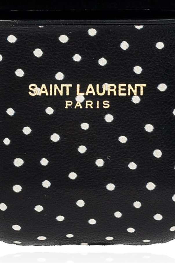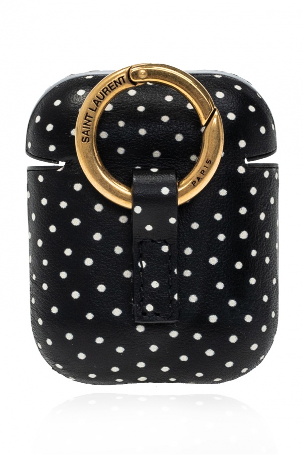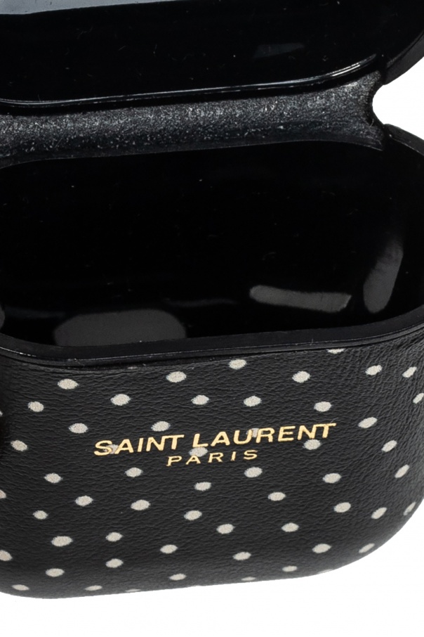 Black AirPods case from Saint Laurent. Made of leather, this design features a printed pattern in cream, gold-tone logo detail and a clip at the back.