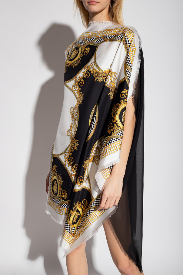 Black and white pareo from Versace. Made of silk, this design features raw cut edges and a Barocco motif in yellow, orange and brown.