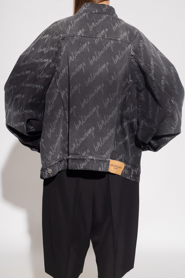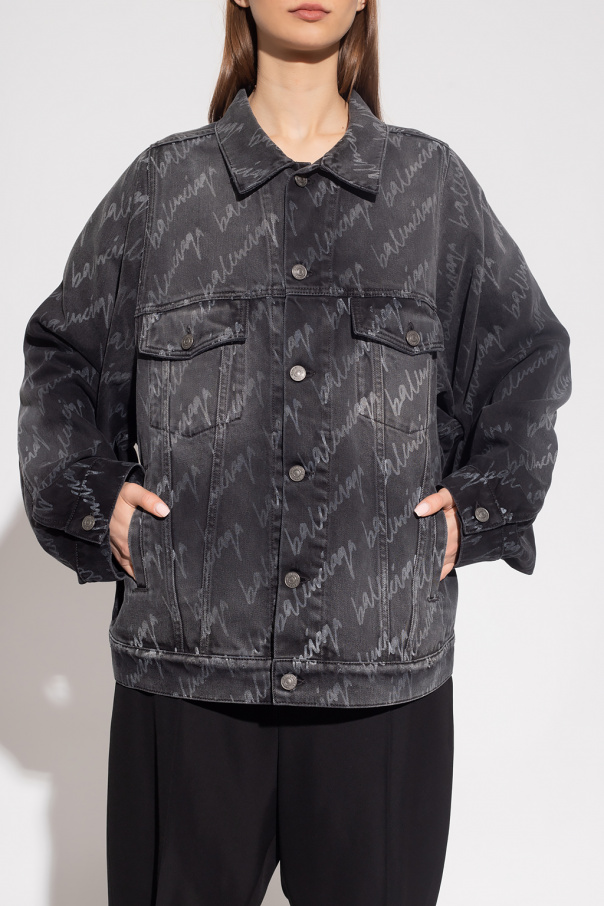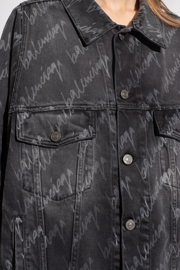 Dark grey denim jacket from Balenciaga. Cut with a relaxed-fitting silhouette, this style features a logo pattern and a vintage treatment. It is complete with button fastenings, two welt pockets and two flapped pockets on the front, a light brown logo patch at the back and long sleeves with button closures on the cuffs.