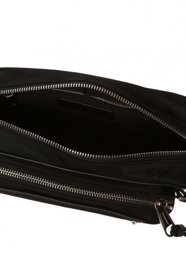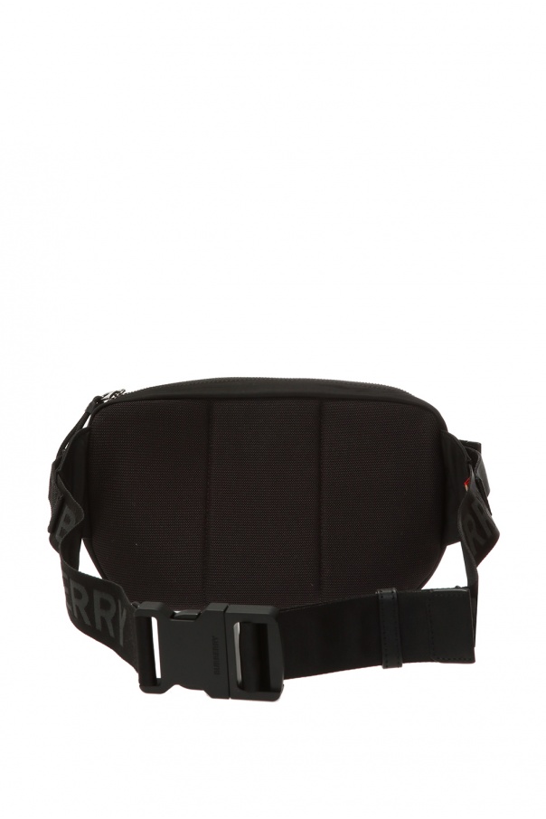 Black belt bag from Burberry. Fastened via zip. Embellished with printed white logo. Features 2 zip pockets on the front, an adjustable waist strap and interior with 1 compartment and 1 zip pocket inside.