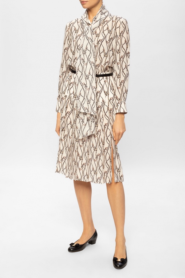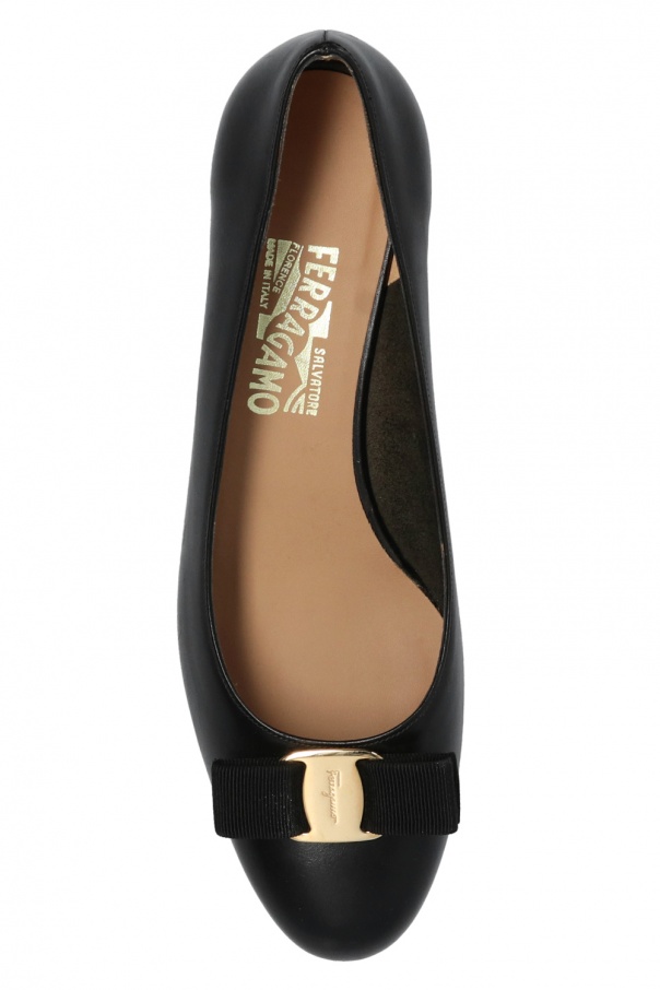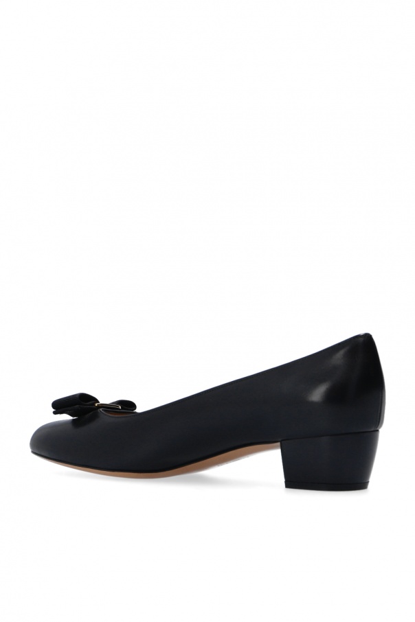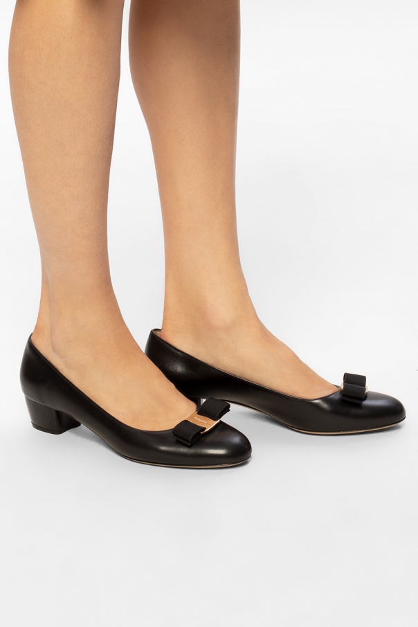 Black 'Vara' pumps from Salvatore Ferragamo. Made of leather, patent heel. Gold-tone logo buckle interwoven with grosgrain bow on the front. Black leather sole.