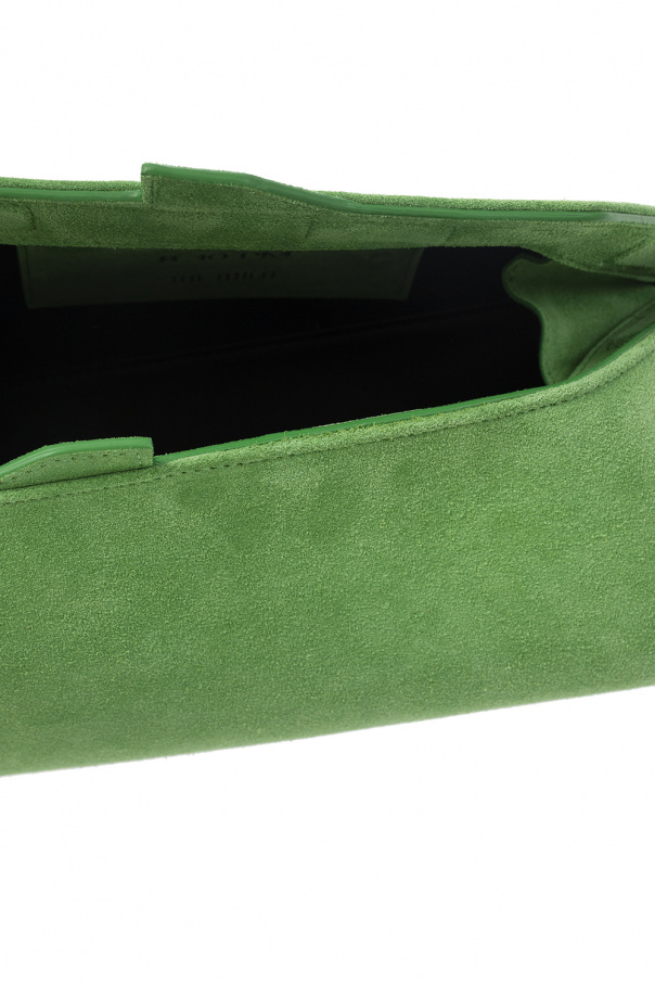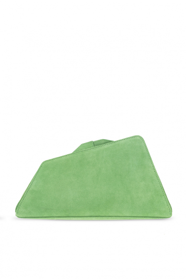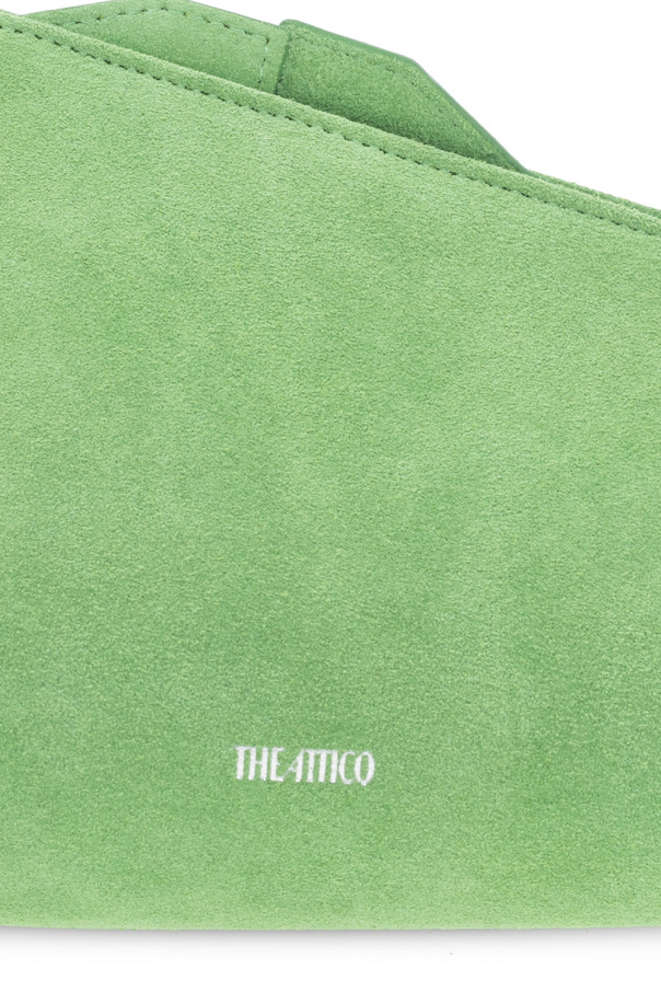 Green ‘8:30 PM’ handbag from The Attico. Crafted from suede with an asymmetrical silhouette, this design features a magnetic snap closure, a silver-tone logo print on the front, silver-tone metal hardware and one internal compartment with a card slot.